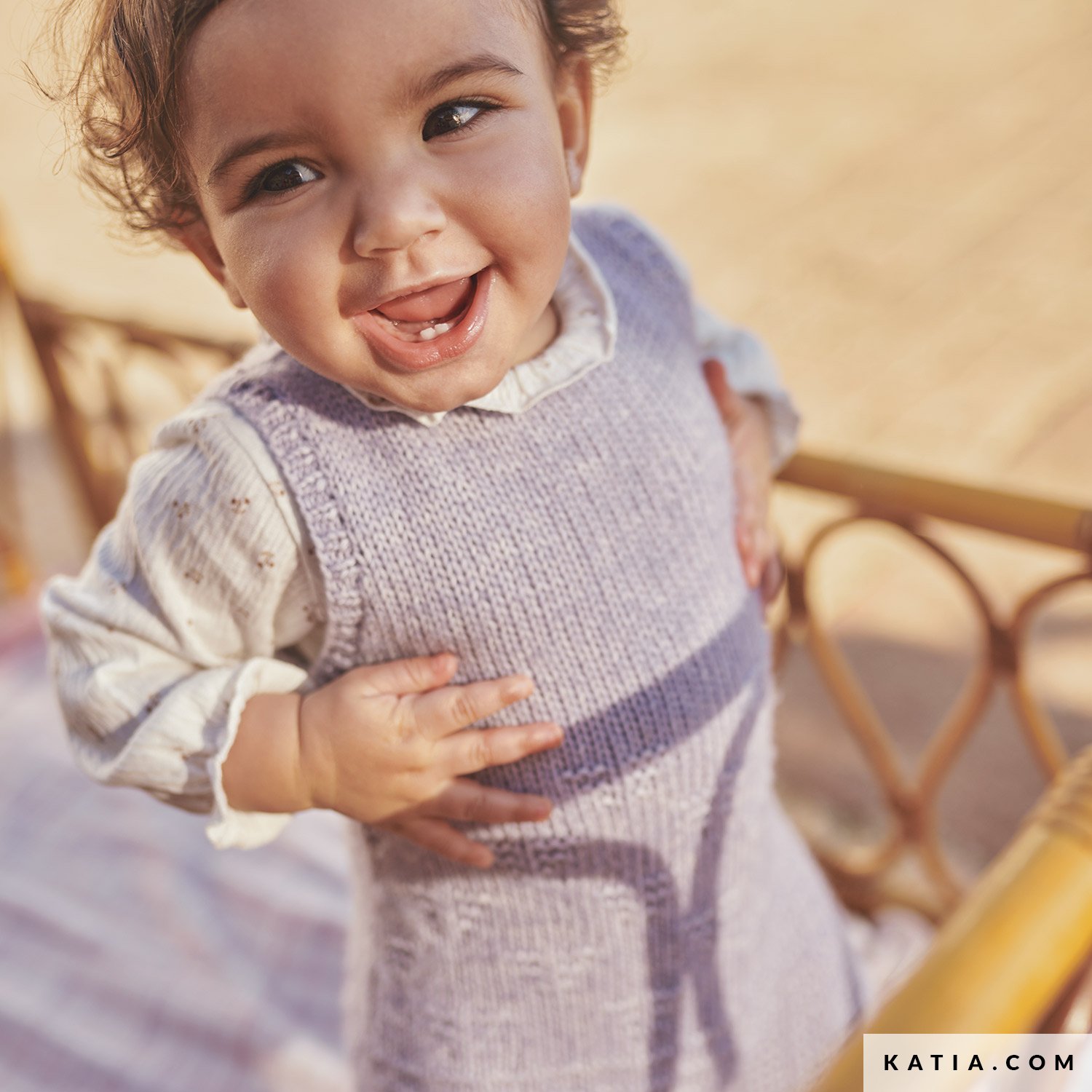 Lavora a maglia una morbida tutina senza maniche e con pantaloni lunghi per neonati con un design a tre blocchi di punti: maglia rasata, farfalle a legaccio e rettangoli in rilievo. Con 5 piccoli bottoni sul retro e rifiniture a coste 1x1, questo modello è perfetto da lavorare con il filato Cotton-Merino Fine di Concept by Katia.