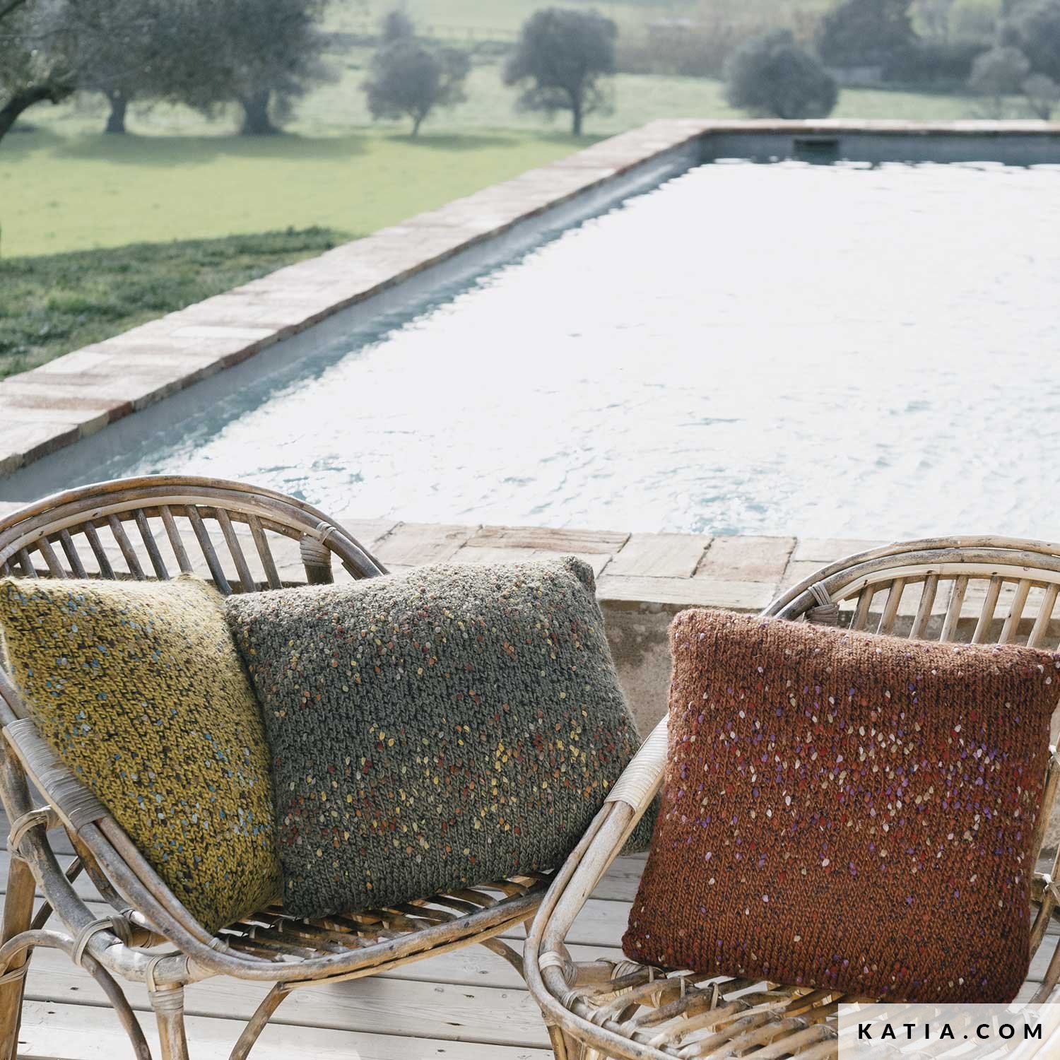 Cerchi semplici idee per lavorare a maglia e dare un nuovo look ai tuoi arredi? Ti proponiamo questo set di cuscini realizzati con i colori autunnali di Azulejo. Aggiungi facilmente quel tocco di colore e stile moderno al tuo divano con questo motivo ai ferri.