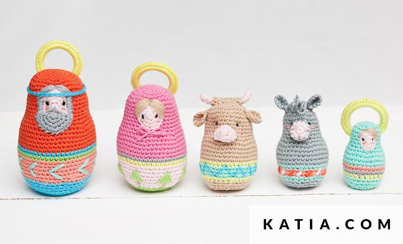 Sorprendi tutti con questo presepe all'uncinetto ispirato alle matrioske russe. Crea Giuseppe, Maria, Gesù Bambino, il bue e l'asinello con dettagli ricamati. Ti basta un set di Amigurumi 100% Cotton per realizzare queste figure uniche e festive.
