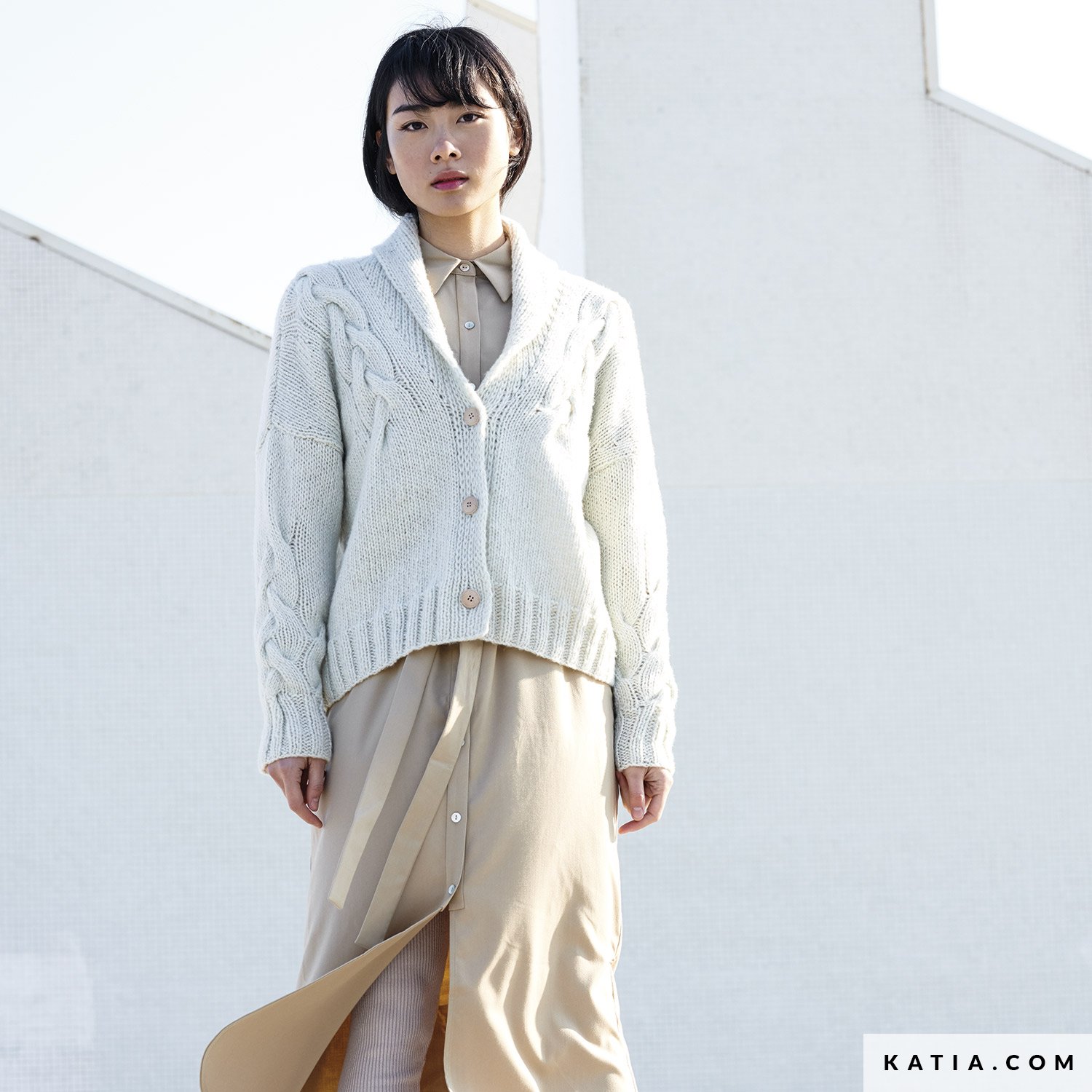 Modello ai ferri per lavorare con Cotton-Merino Glam una maglia da donna con chiusura con bottoni. Le grandi trecce nella parte bassa delle maniche e nella parte superiore del capo danno un tocco di eleganza a qualsiasi look.