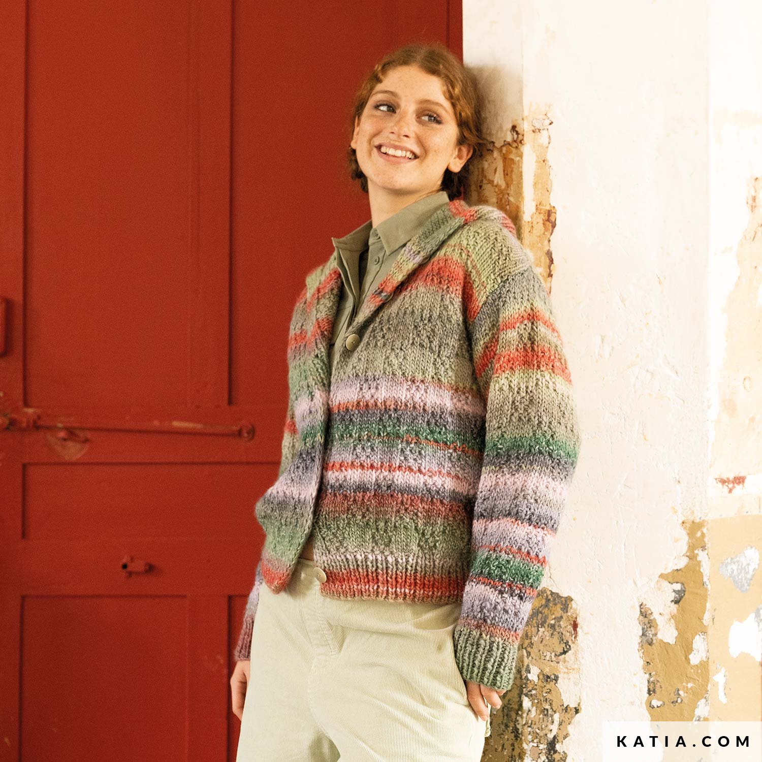 Aggiungi un tocco unico e speciale al tuo look sportivo con questa giacca ai ferri! Realizzata con il filato Katia Azteca, la sua colorazione multicolor crea il perfetto look fatto a mano. Con taglio dritto e cappuccio, presenta 7 bottoni per chiudere in abbinamento con il modello. È il momento di distinguerti per il tuo particolare stile casual!