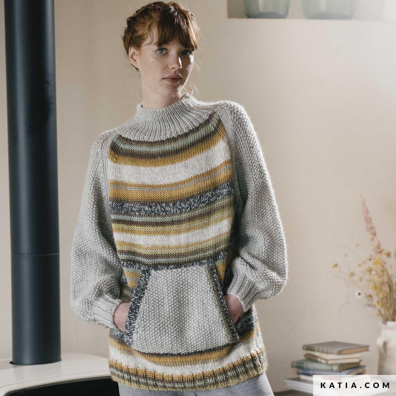 Combina Kirei e Kirei Color nei tuoi modelli e ottieni risultati incredibili come dimostra questo maglione raglan con colletto Perkins. Lavora davanti e dietro con Kirei Color per una stampa a righe degradè. Completa il modello lavorando a maglia con Kirei maniche, colletto e tasca a marsupio per tenere le mani calde in questo freddo inverno.