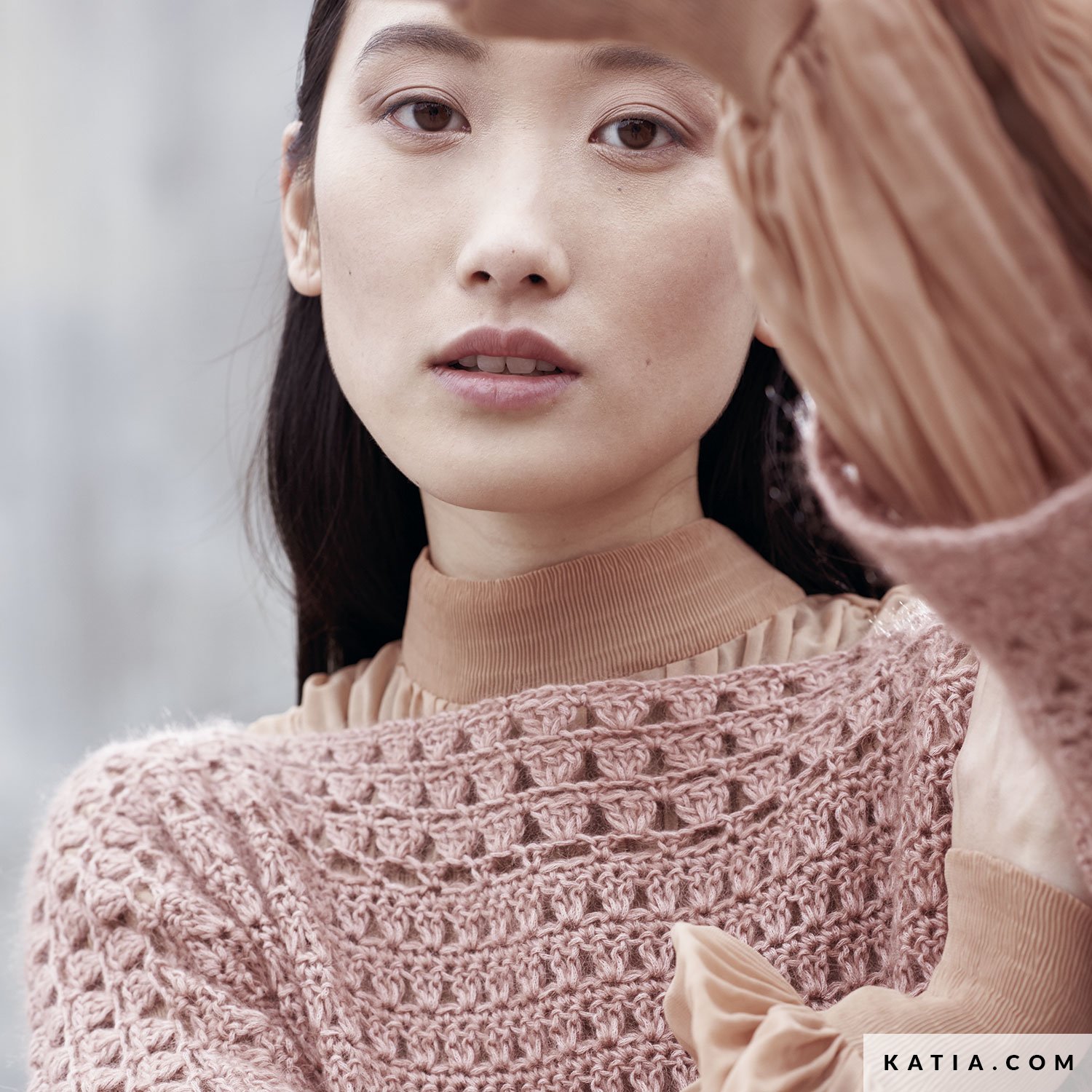 Originale maglione all'uncinetto con Mohair-Cotton in un colore nude molto contemporaneo. Questo modello in stile giapponese presenta ampie maniche 3/4, uno scollo a barchetta e una studiata applicazione di punti uncinetto per dividere visivamente il collo, le spalle e la linea verticale delle maniche dai polsini.