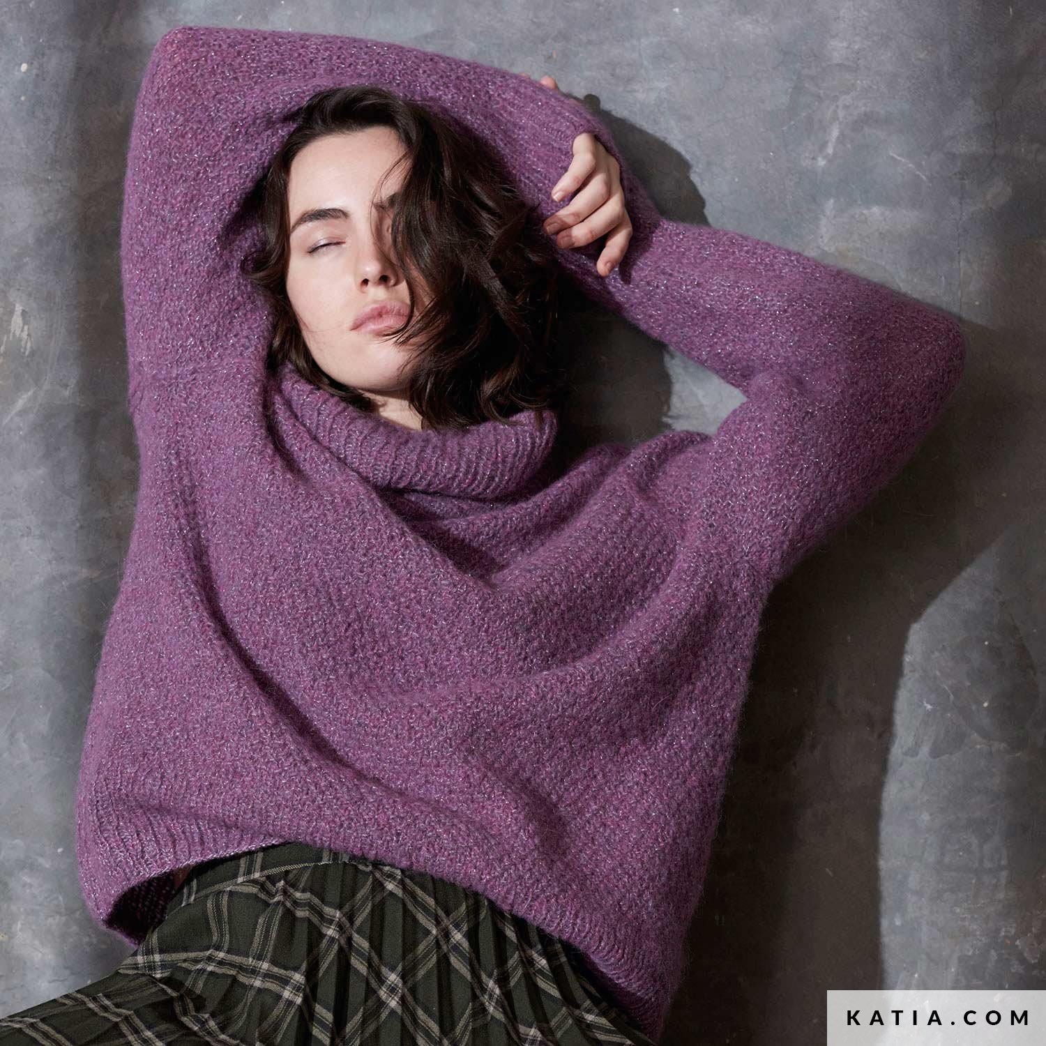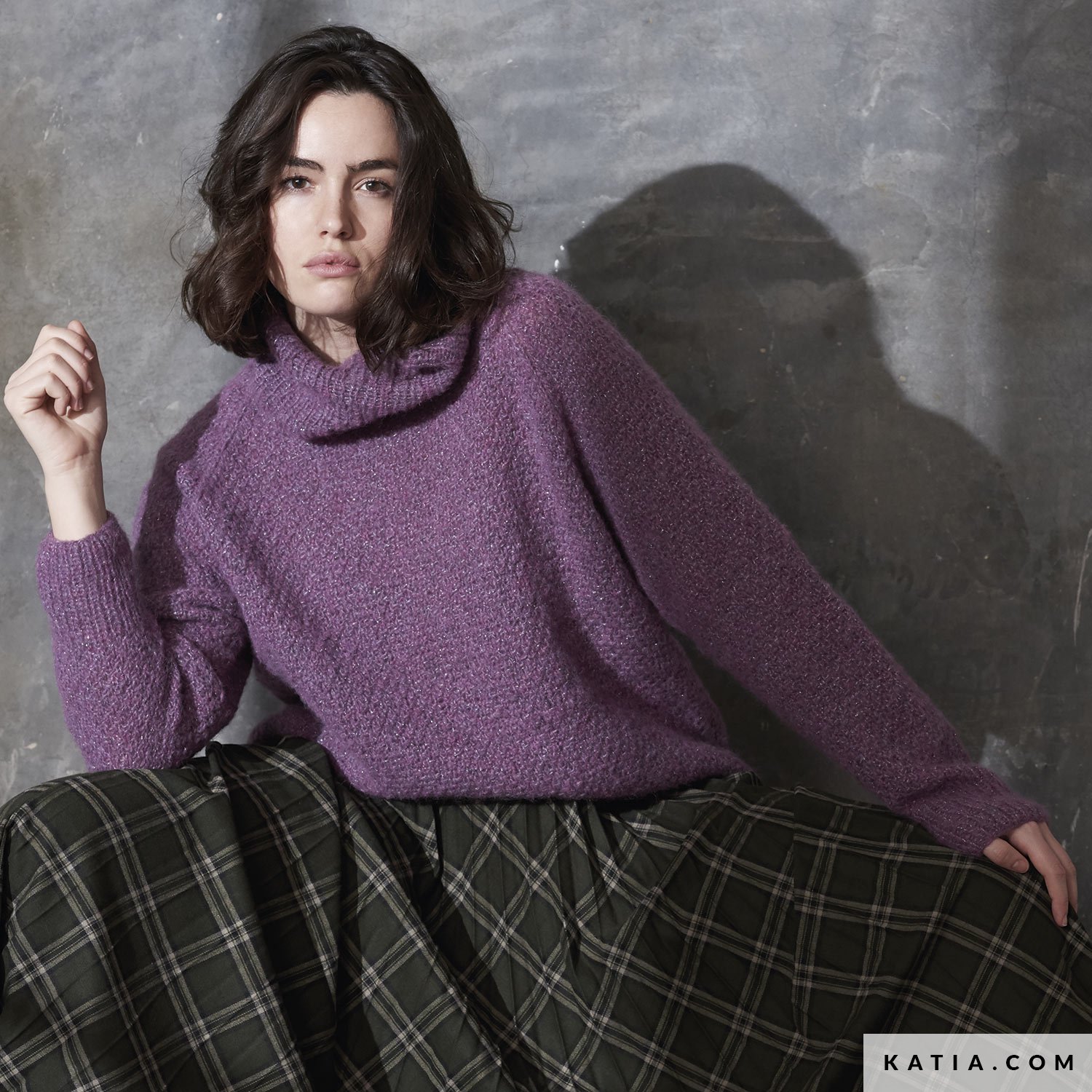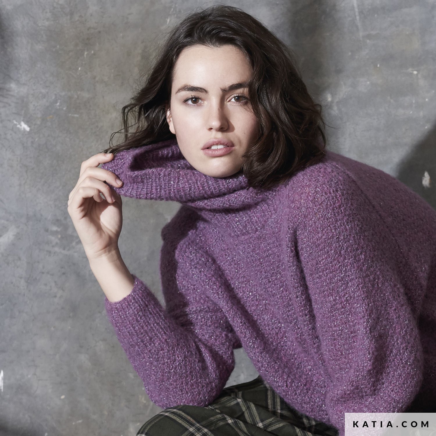 Realizza un maglione viola lavorato a maglia con il filato Alpaca Silver, uno dei colori di tendenza della stagione, con una lucentezza extra in argento. Un modello Katia Plus Sizes molto leggero e moderno, perfetto da indossare con le gonne. Godersi un maglione con maniche raglan e con un collo alto a sbuffo è molto facile con questo modello Concept by Katia.