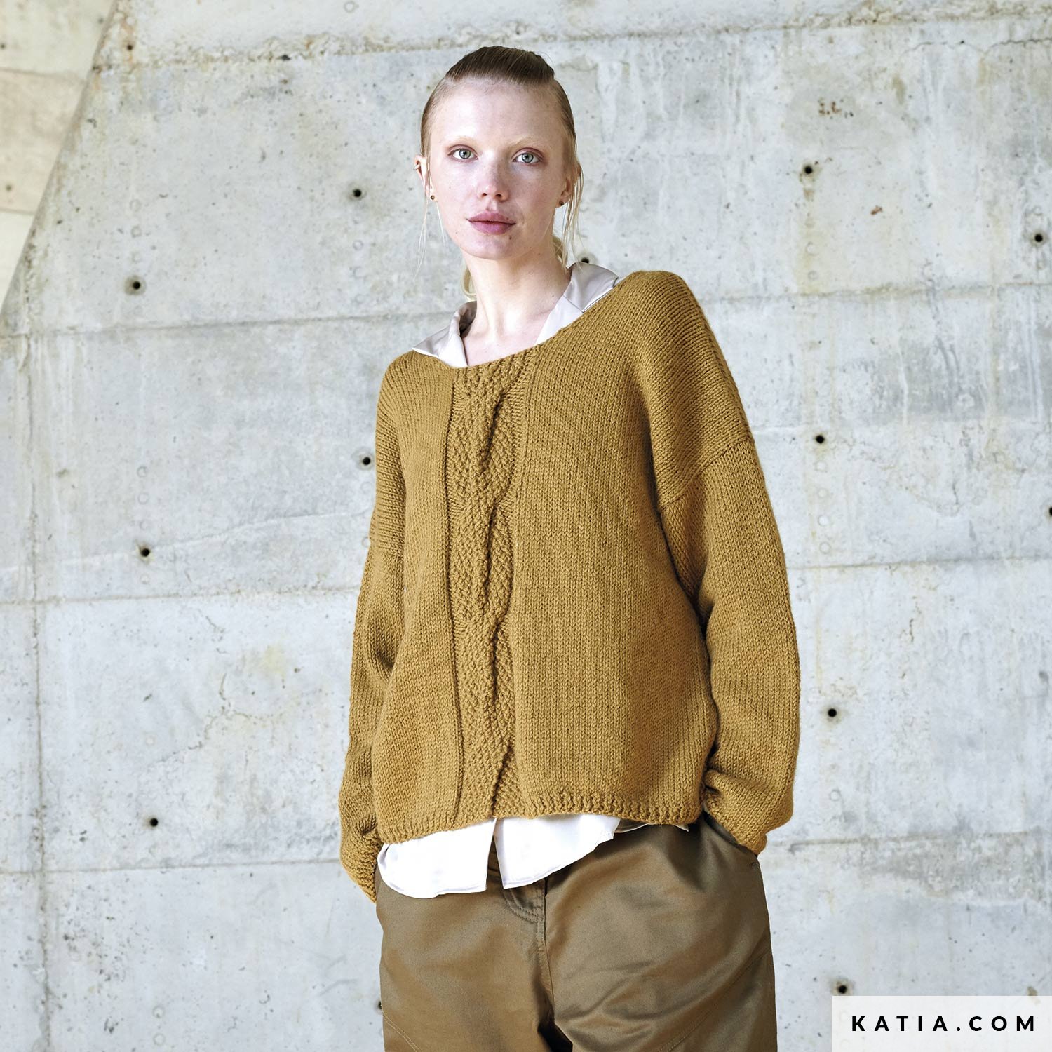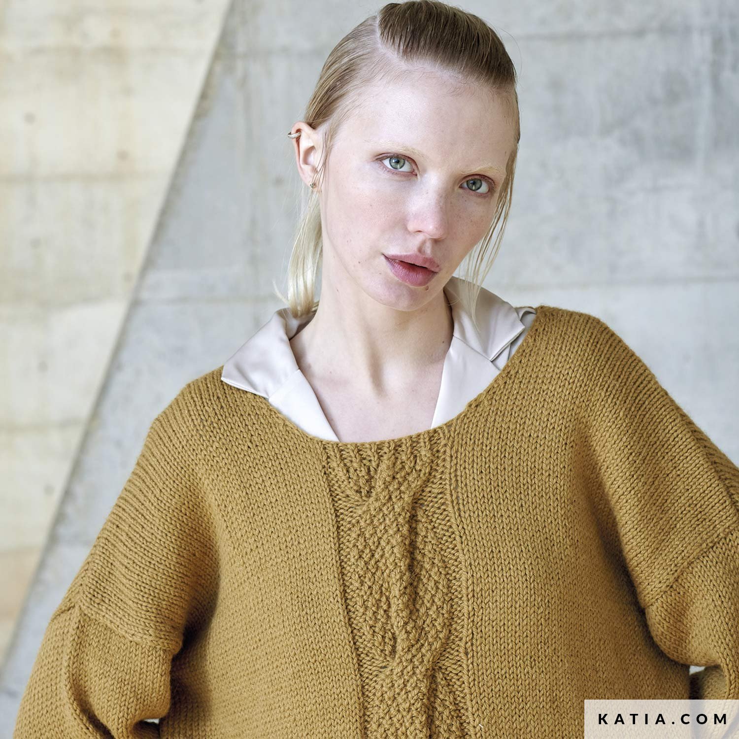 Questa maglia da donna ai ferri dalle linee diritte è l'ideale da indossare tutti i giorni con jogger e sneakers. Ha un ampio scollo quadrato e una grande treccia centrale come ornamento. Lavora il tuo maglione con i colori di Essential Alpaca che preferisci.