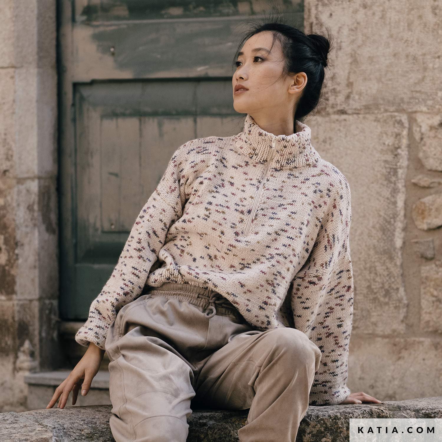 Segui questo schema per realizzare un maglione con il filato stampato Basic Merino Tweed, perfetto per dare un tocco moderno al tuo look di tutti giorni. Il capo è molto semplice, ma ha dei dettagli molto moderni, come il collo alto con cerniera e le maniche a sbuffo.