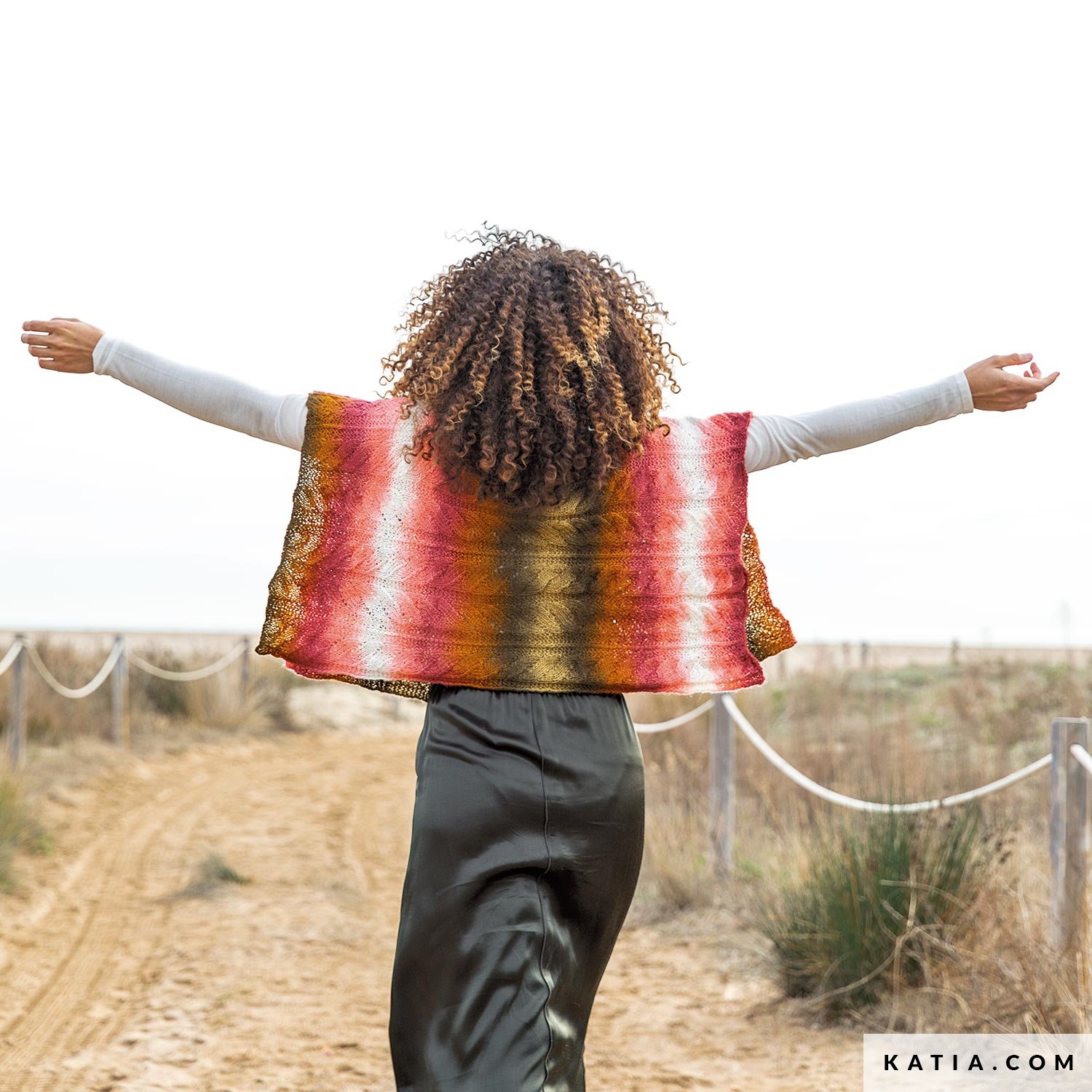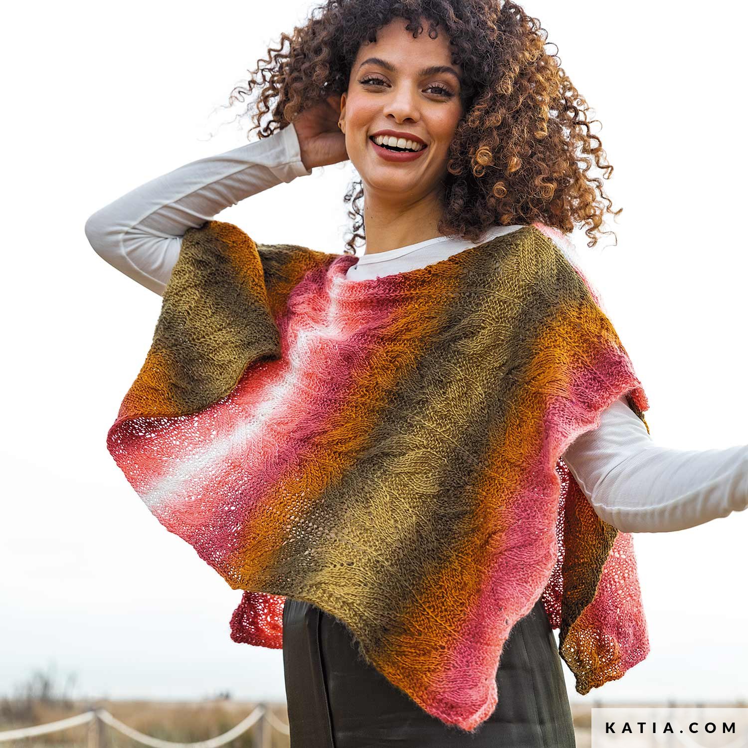 Questo modello di poncho i ferri è perfetto per gli amanti della moda e della comodità. Con il filato Afrodita, lavora due parti rettangolari a motivo lavorato per creare un poncho rettangolare con una combinazione originale di righe colorate. Questo capo è molto versatile e può essere abbinato a gonne e vestiti lunghi. Ti piacerà molto il risultato finale!