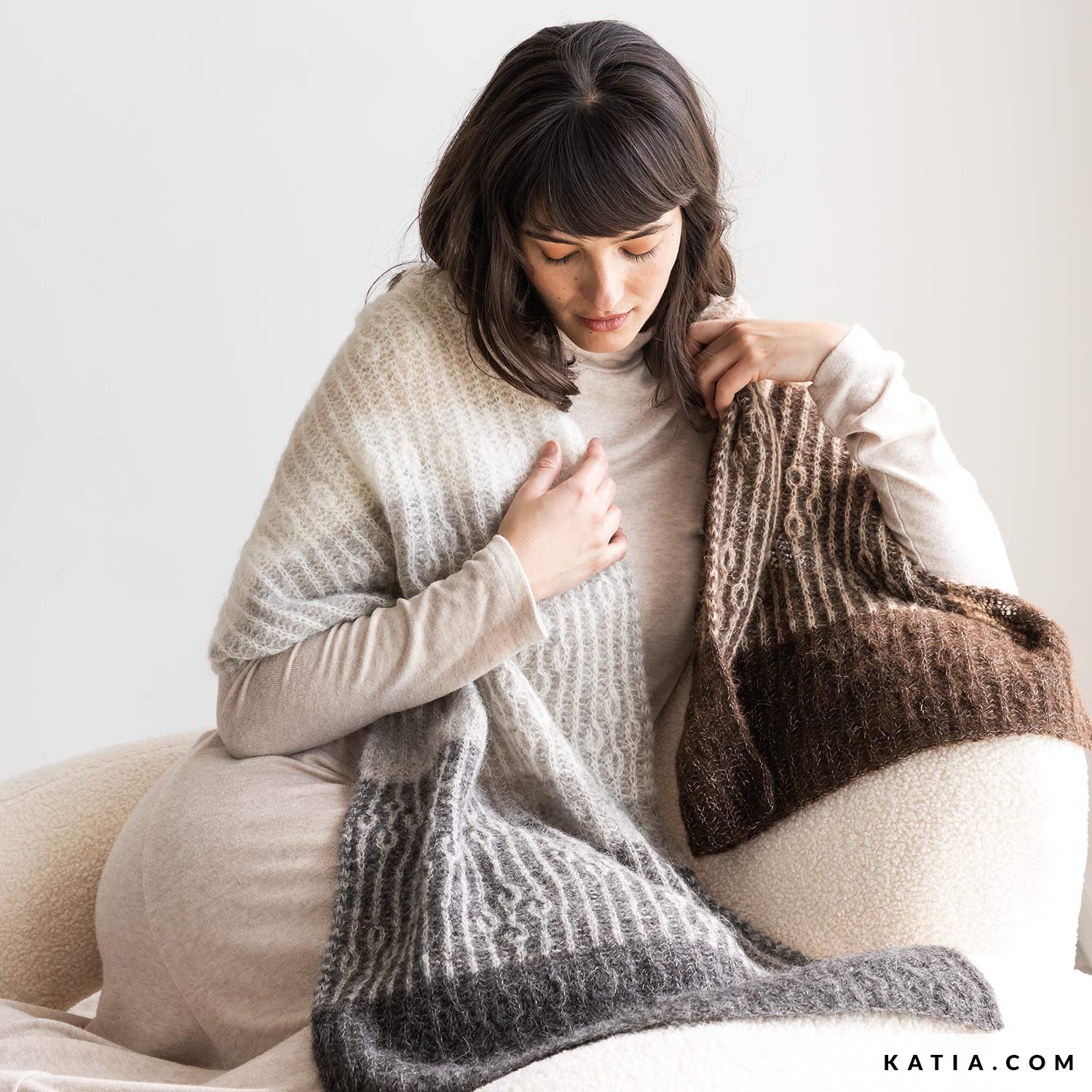 Il Traverse Wrap, disegnato da Julie Knits in Paris in collaborazione con Katia, è uno stola sofisticata e incantevole che cattura la bellezza naturale di Silk-Alpaca Natural Colors di Concept by Katia. Questa stola rettangolare, decorata a punto brioche, si abbina bene ai sei colori dell'alpaca con i colori della seta, creando un effetto visivo particolare attraverso i suoi blocchi di colore.