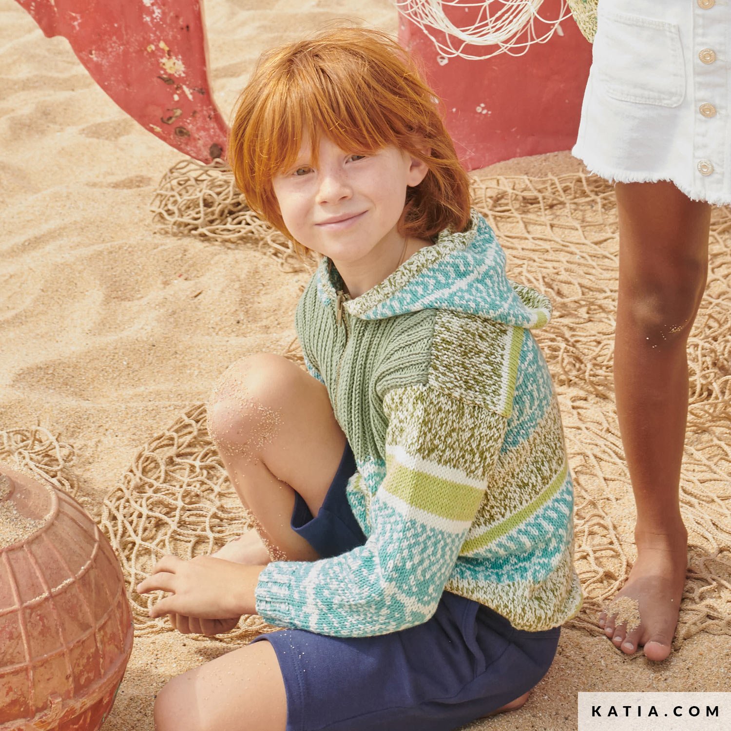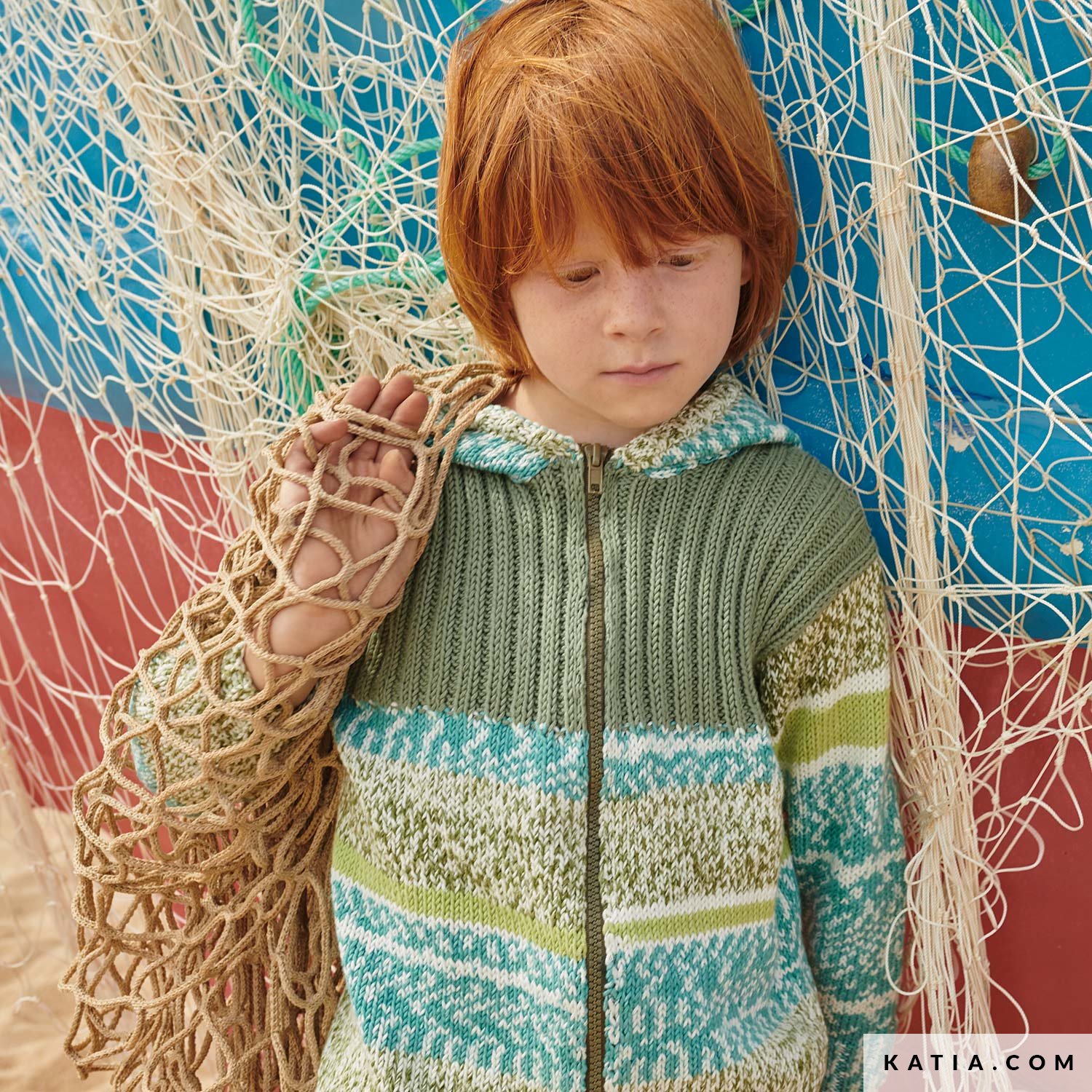 Prepara alcuni gomitoli di Mediterranea e un colore complementare di Cotton 1005 per lavorare una giacchetta con cappuccio e chiusura con cerniera da bambino. Oltre a combinare facilmente un filato con stampa jacquard con un altro colore a tinta unita, ti proponiamo un modello ai ferri molto versatile, realizzato con 2 soli punti basici.