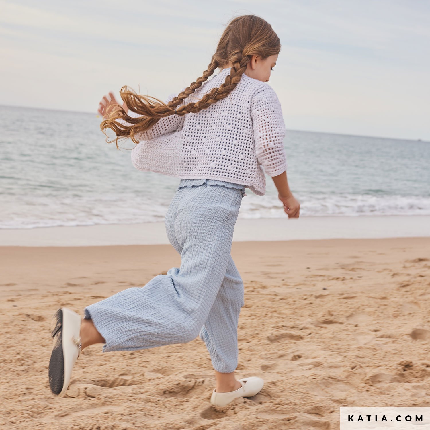 Versione finale: Lavora all’uncinetto questa giacca a maniche ¾ da bambina con Katia Estrella, un filato dal sottile luccichio. Il modello corto combina un motivo traforato con piccoli nodi e si chiude con un bottone al collo. Disponibile sulla rivista Katia Niños 117 e in PDF su katia.com. Divertiti a creare una giacca estiva per tua figlia per la tua nipotina.