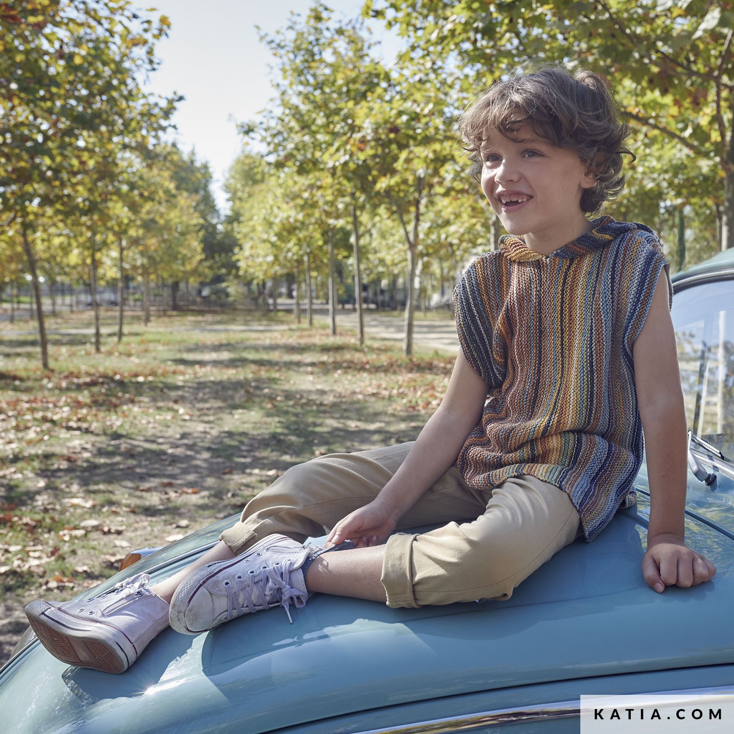 Inizia lavorare una maglia senza maniche con cappuccio di ispirazione hippy, con uno stampato a righe verticali sottili in stile etnico con Paraiso e questo modello facile presente nella rivista Katia Bambini 101. Rilassati e goditi un modello semplice, lavorato in orizzontale, a legaccio e con aperture laterali per garantire la comodità e libertà di movimento dei piccoli hippy.