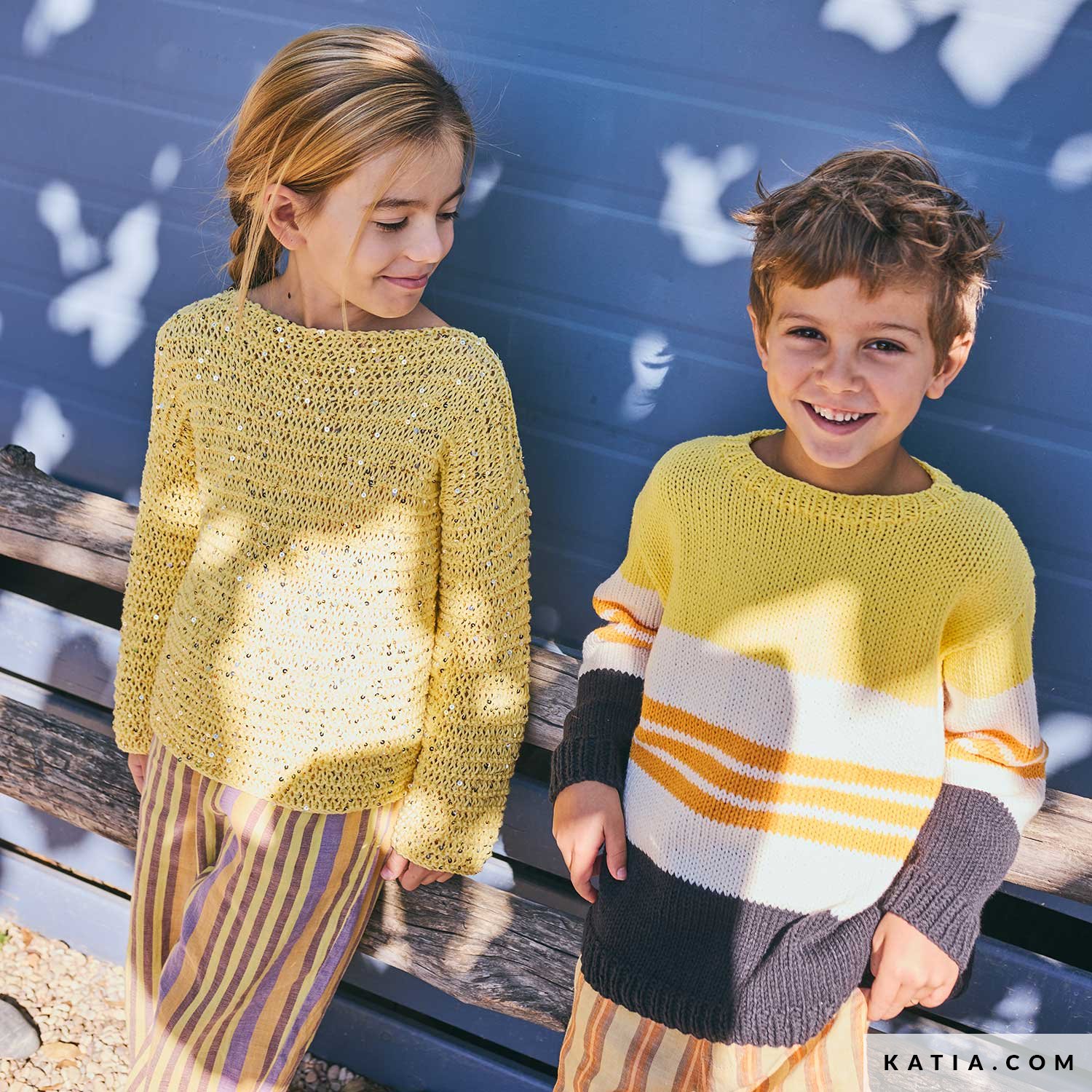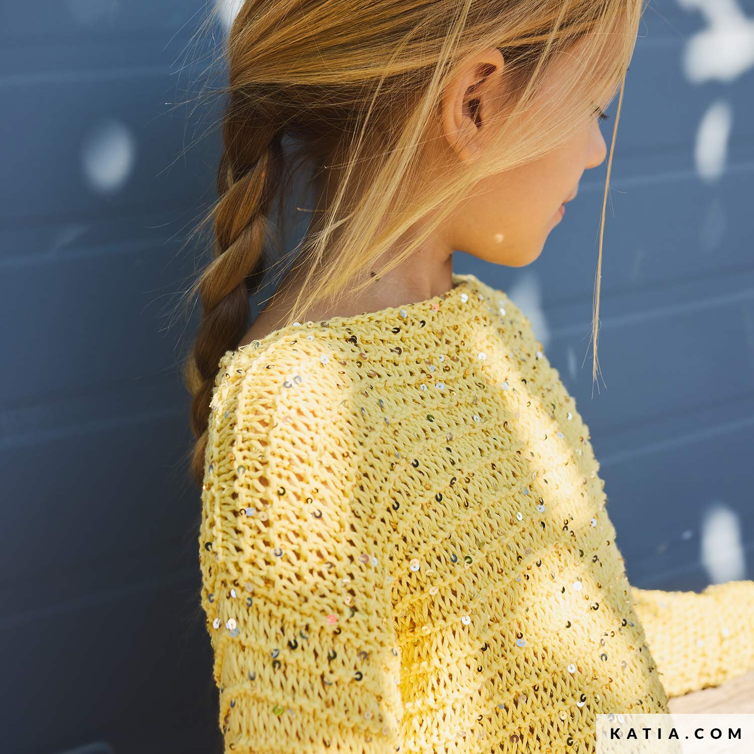 Questo semplice modello di maglione da bambina si lavora ai ferri a motivo con Katia Cleopatra, un cotone morbido decorato con delicate paillettes dorate e argentate. La linea dritta è comoda e leggera, ideale per l’uso quotidiano con un tocco di luminosità. Disponibile sulla rivista Katia Niños 117 e in PDF su katia.com. Prova a lavorare un capo moderno e divertente per la tua piccola.