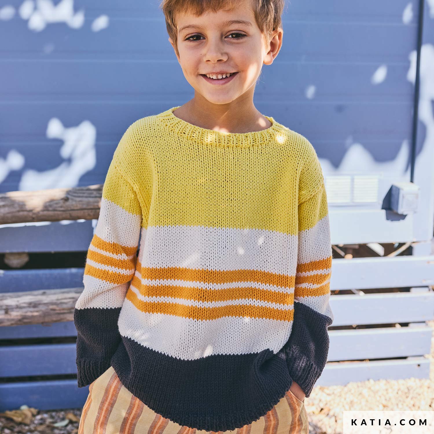 Con questo modello di maglia da bambino lavori ai ferri un capo facile e confortevole con Katia Alabama, un cotone dalla mano morbida, ideale per la mezza stagione. Il design dritto combina blocchi di colore con righe a contrasto su corpo e maniche. Disponibile sulla rivista Katia Niños 117 e in PDF su katia.com. Personalizzalo con i colori preferiti dei tuoi bimbi o dei tuoi nipoti.