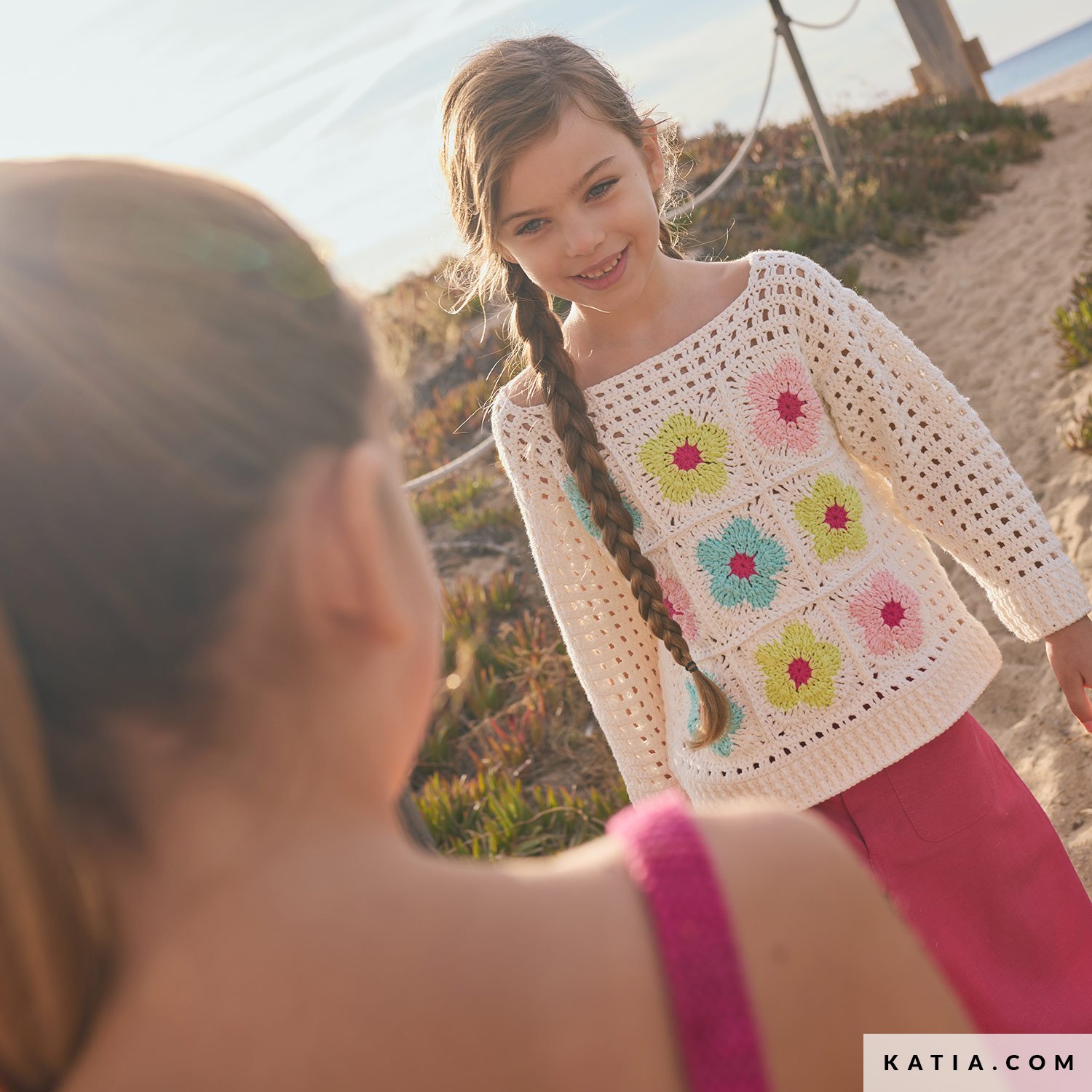 Un maglione all’uncinetto pieno di colore per bambine, lavorato con Katia Cotton 100%, un cotone morbido e opaco perfetto per pelli sensibili. Il davanti unisce quadrati granny a fiori multicolore su sfondo écru e il resto del corpo presenta un punto traforato leggero. Disponibile sulla rivista Katia Niños 117 e in PDF su katia.com. Lavora all’uncinetto un capo comodo e divertente per questa estate.