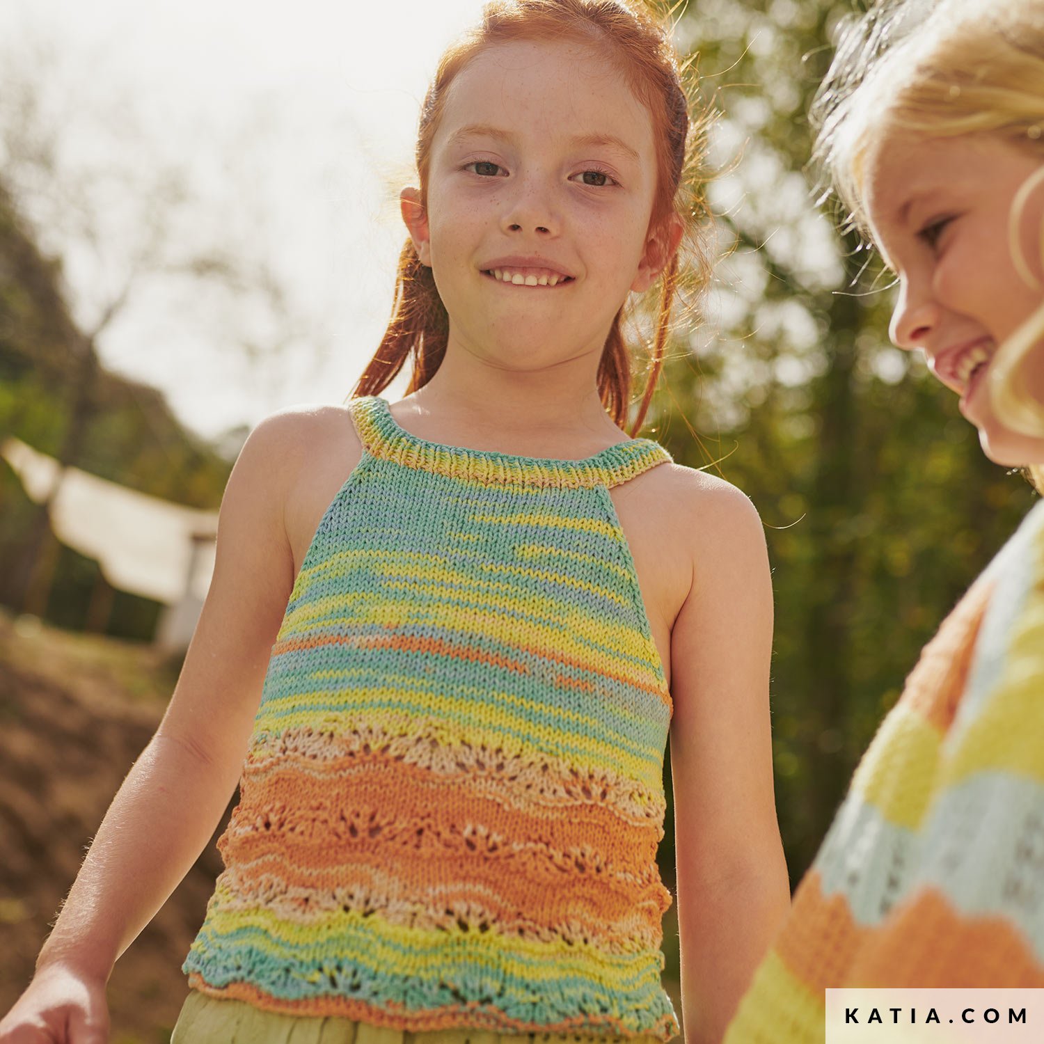 Il modello di questo top senza maniche da bambina presenta una bellissima lavorazione con trafori nella parte inferiore ed è ideale per le giornate più calde dell'estate. Utilizza Katia Menfis Color, un filato di cotone morbido e delicato, per un risultato ottimale. Trova questo modello nella rivista Bambini 109 e inizia a lavorare a maglia oggi stesso. Crea capi unici e affascinanti per le piccole fashioniste!