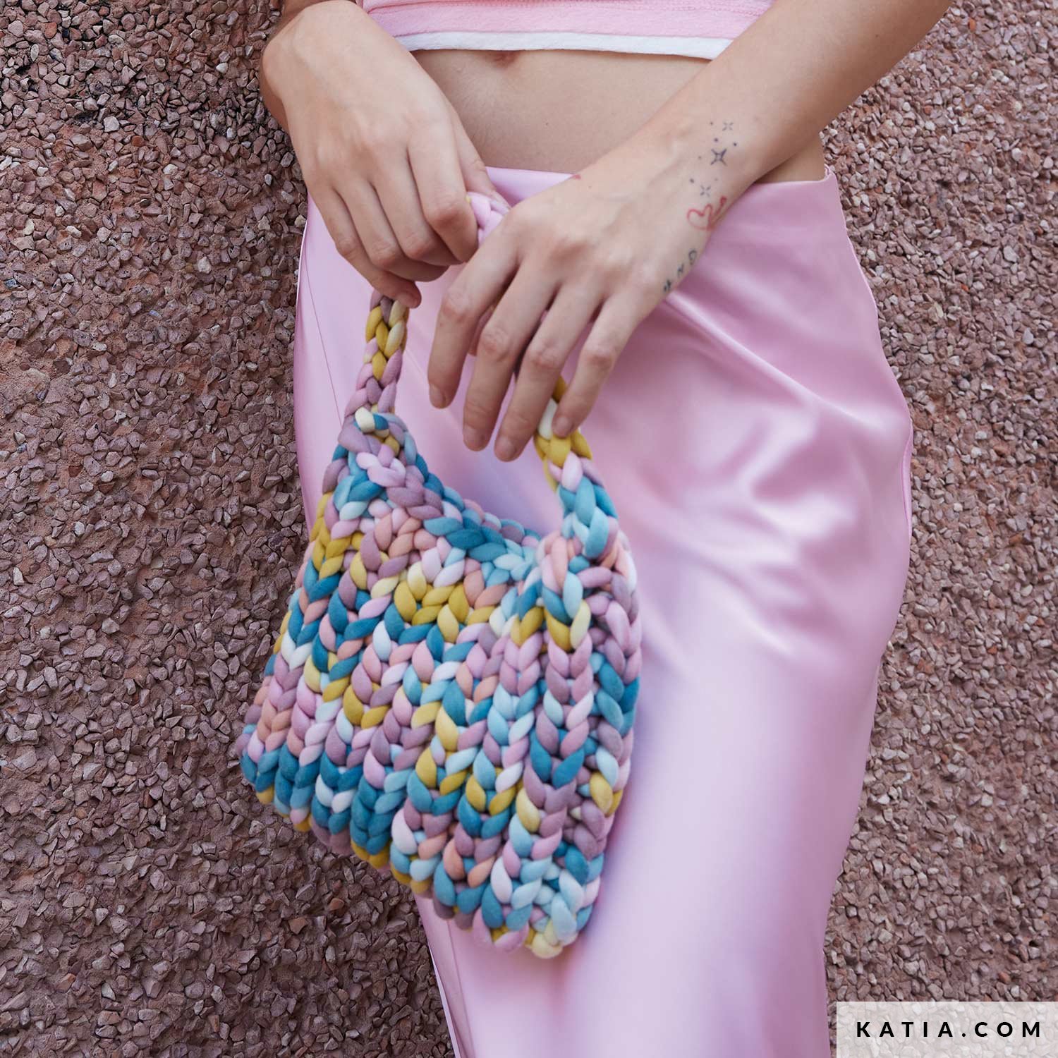 Borsa a mano ai ferri, lavorata a maglia rasata con un solo gomitolo di WOW Marshmallow, per un effetto soffice, voluminoso e una texture piacevolissima. Un modello attuale e divertente, perfetto per dare un tocco speciale ai tuoi look. Trova il modello su katia.com e sulla rivista Bag to Basics. Goditi il processo e questestate sfoggia la tua borsa handmade.