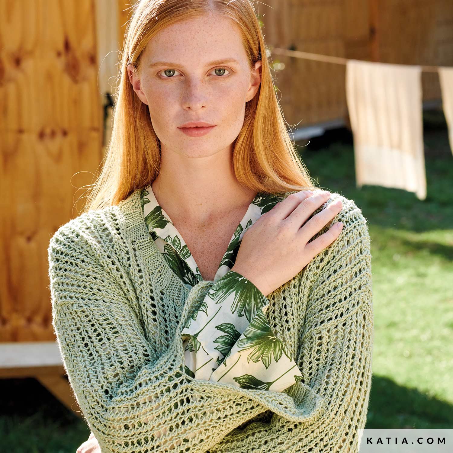 Questo modello di maglia girocollo con motivo traforato da donna è l'ideale per dare un tocco moderno al tuo look. Il filato Dama è un filato in fibra naturale che conferisce a questo cardigan una trama unica e lo rende perfetto per essere un capo retrò del tuo guardaroba. Ti suggeriamo di lavorarlo in uno dei colori di tendenza dell'estate e di abbinarlo a un vestito o una gonna.