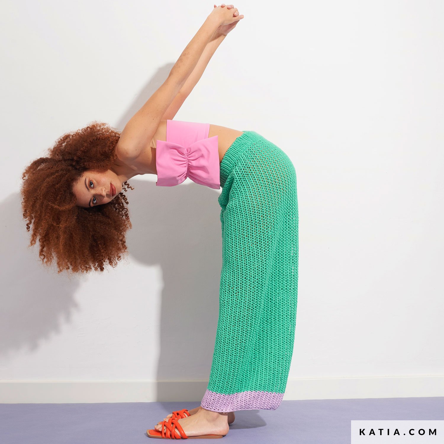 Questo pantalone palazzo all'uncinetto è il capo perfetto per brillare con stile e tendenza questa estate! Realizza con il filato Summer Vibes di WOW! By Katia il pantalone Maya disegnato da @studioceliahoste. Goditi un modello che si evidenzia per il motivo traforato e l'uso di un colore in contrasto sul fondo dei pantaloni. Rivoluziona il tuo guardaroba con questo pantalone all'uncinetto moderno e innovatore, ideale per brillare durante le serate di festa estive.