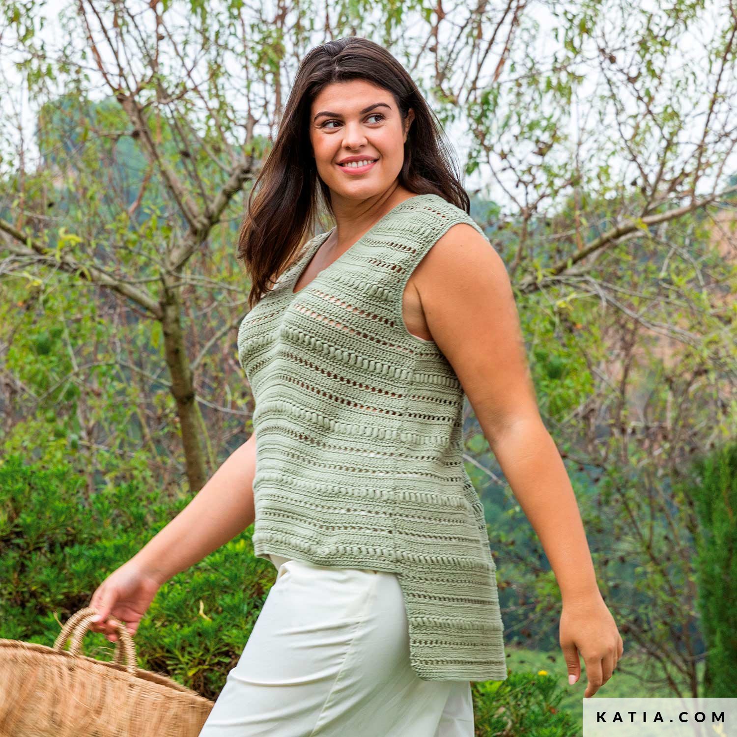Lavora un top smanicato asimmetrico all'uncinetto con questo modello Katia Plus, la nostra linea di modelli ai ferri e all'uncinetto nelle taglie forti. Devi solamente scegliere il tuo colore preferito di Katia Panama per realizzare una maglia dalla lunghezza disuguale, combinando diversi tipi di punti all'uncinetto. Indossa capi fatti da te e divertiti a imparare nuovi punti.