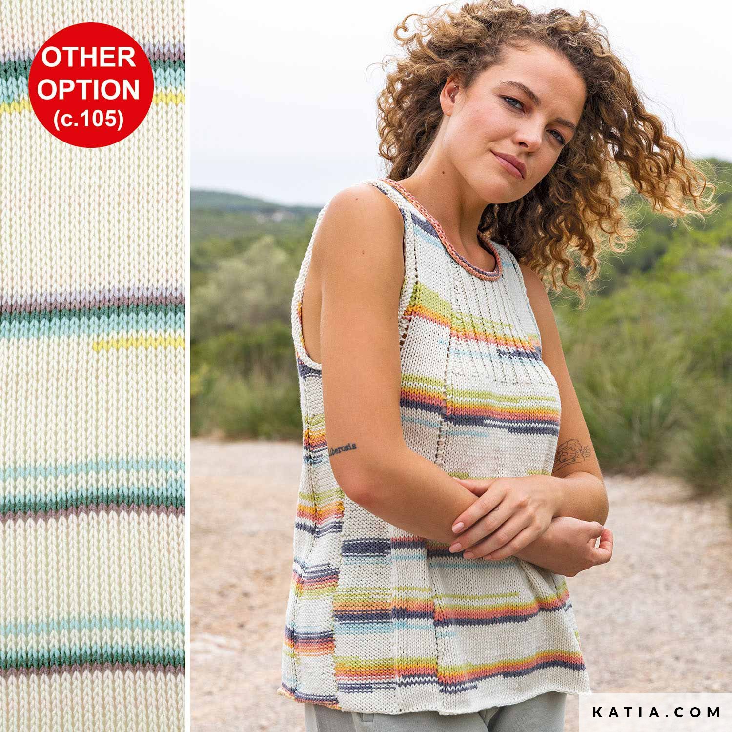 Questa maglia senza maniche moderna e alla moda è la perfetta compagna per i look più sportivi. Lavorata con il morbido filato Alabama Flash, unisce righe di colori sfalsate per dare un tocco divertente. Il collo tondo dona eleganza al top, mentre i punti impiegati creano motivi unici. I dettagli del petto e i cambi di punto danno un tocco speciale al capo, perfetto da indossare con i leggins per sentirsi super comoda.