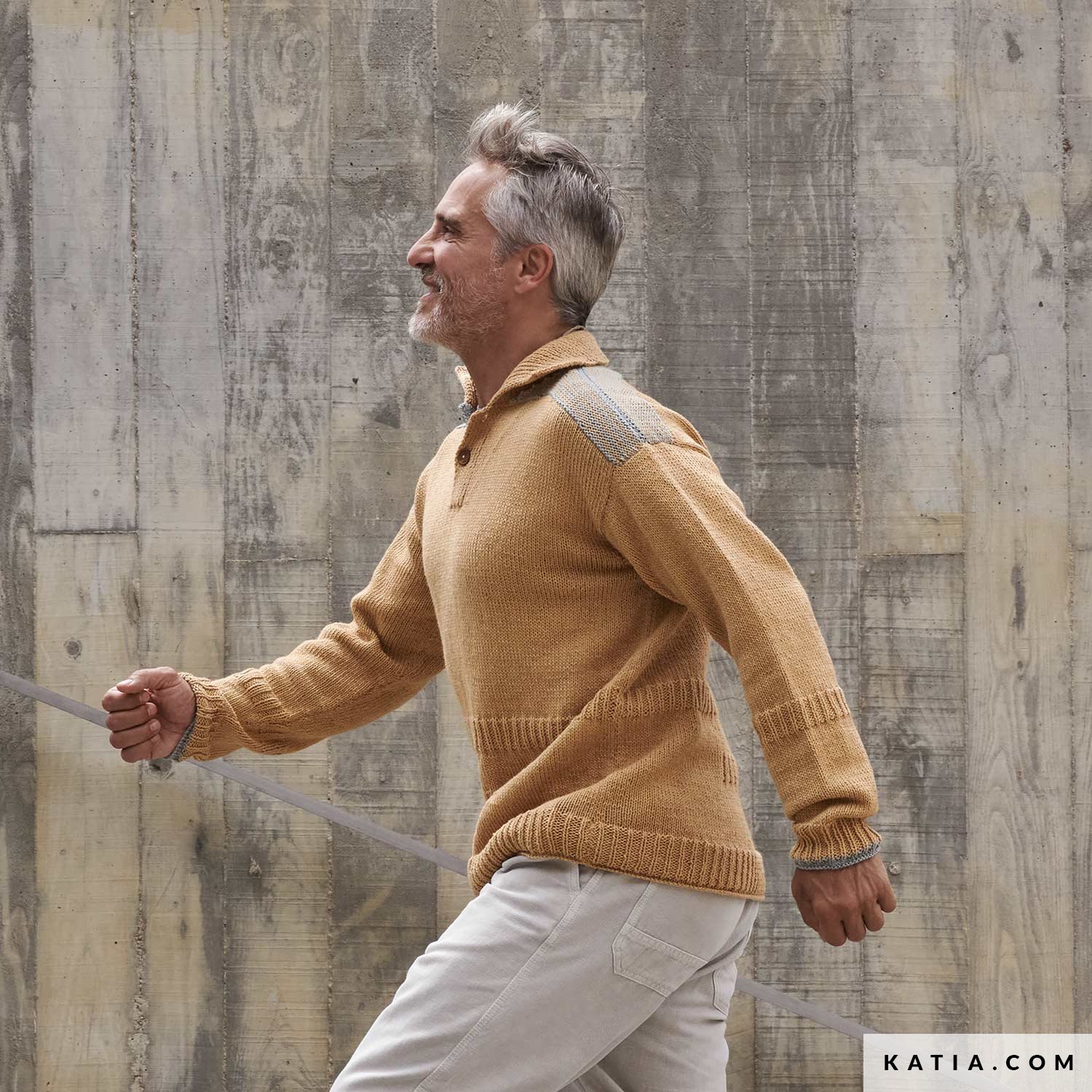 Lavora un elegante maglione con collo tipo polo da uomo con questo modello da realizzare con Cotton-Yak di Concept by Katia. Questo modello presenta strisce a contrasto di colore, sia sulle spalle che sulla patta, che vengono lavorate con la tecnica Intarsia. Con linee decorative sui bordi e 2 bottoni sul collo, è il modello perfetto per creare la tua combinazione di colori. Scopri questo modello ideale per imparare nuove tecniche e sfoggiare stile al lavoro!