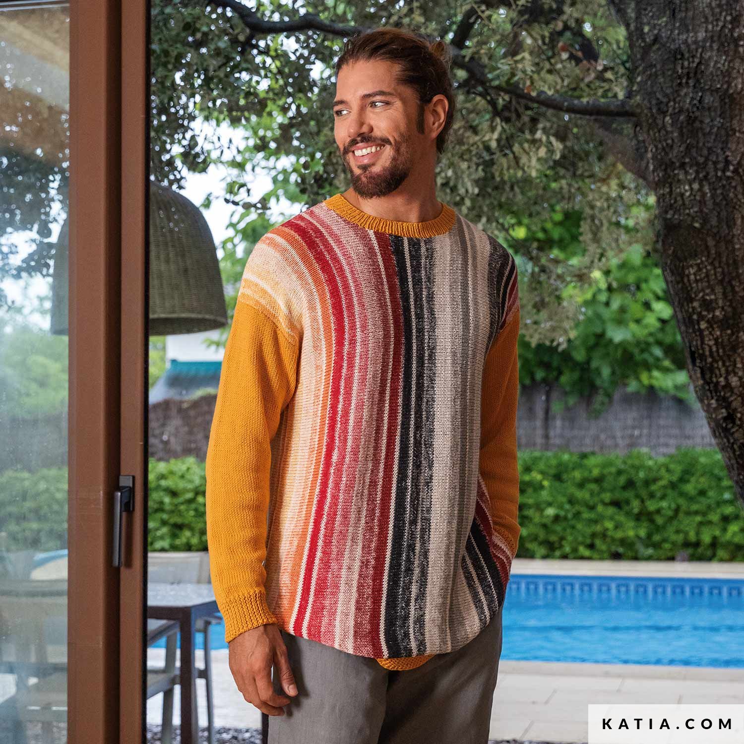 Crea una maglia unica da uomo con Katia Fair Cotton Infinity e Katia Fair Cotton, due filati sostenibili e morbidi 100% cotone biologico. Il suo design combina linee verticali e dettagli a coste, ideali per giocare con i colori e dare vivacità a qualsiasi look. Prova la soddisfazione di indossare un capo fatto con le tue mani.