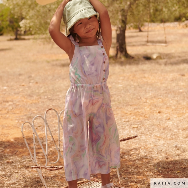 Naai dit prachtige model voor een jumpsuit met schouderbanden met ruches met een knoopdetail aan de voorkant. Het patroon met stap-voor-stapuitleg vindt u in het nieuwe naaitijdschrift Mediterranean Voorjaar-Zomer 23 van Katia Fabrics. Maak het met een van de popeline stoffen met opdruk van Katia Fabrics of met de nieuwe designs met ecoviscose.