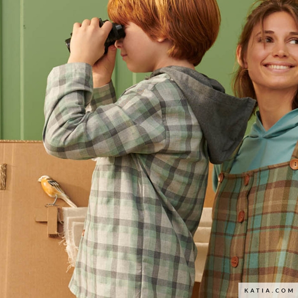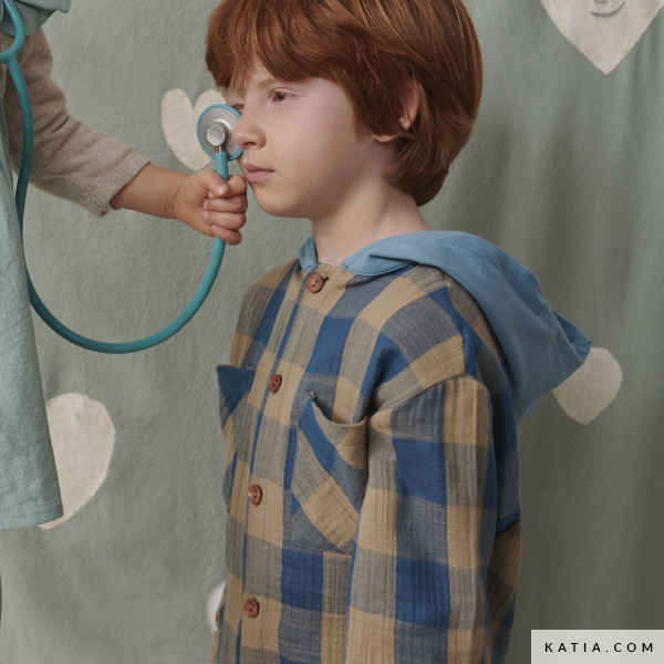 Sportief shirt met lange mouwen en capuchon. Naai dit patroon met de Recycled Tartan Viyelas voor een alledaagse look.