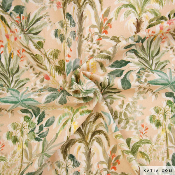 Geef je kleding een exotische touch met Ecoviscose Cocoa Fruit Palm, een 100% duurzame EcoVero viscose stof van Katia Fabrics. De print van palmbomen op een zachte beige achtergrond maakt het de perfecte keuze voor lange jurken, boho tunieken, luchtige overhemden en frisse rokken. De milieuvriendelijke, lichte en ademende stof biedt een zijdezacht gevoel, ideaal voor lente en zomer.