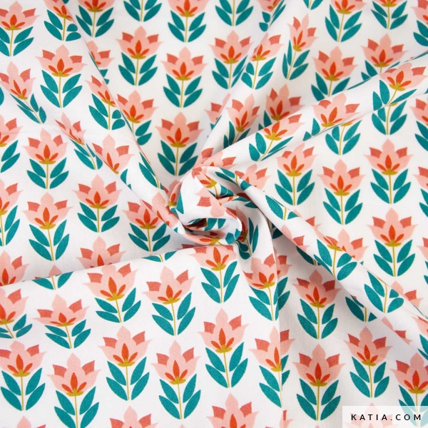 Katoenen popeline stof per meter met een uniek bloemenpatroon in groen en oranje tinten op een zandkleurige achtergrond. De popeline stof 70's Flowers is een stof die je in staat stelt om unieke en zeer speciale kledingstukken of accessoires te maken voor het hele gezin. In het naaipatronenmagazine Dance Herfst-Winter 24/25 van Katia Fabrics vind je diverse naaipatronen om originele blouses, jurken en accessoires te naaien met deze katoenen popeline stof.