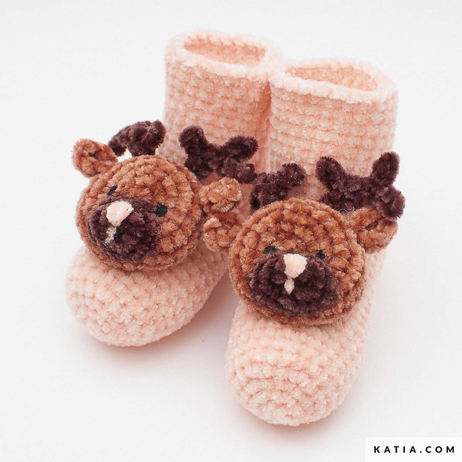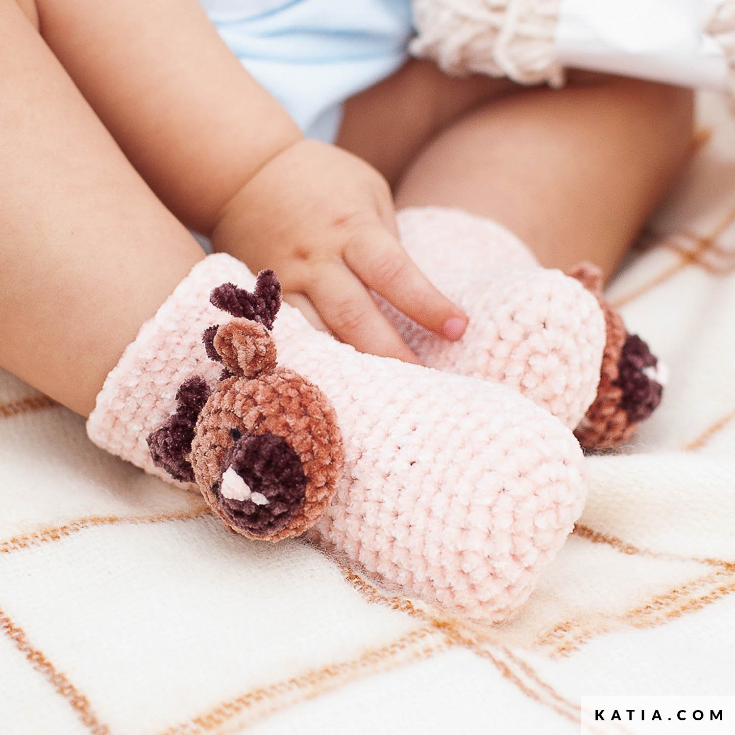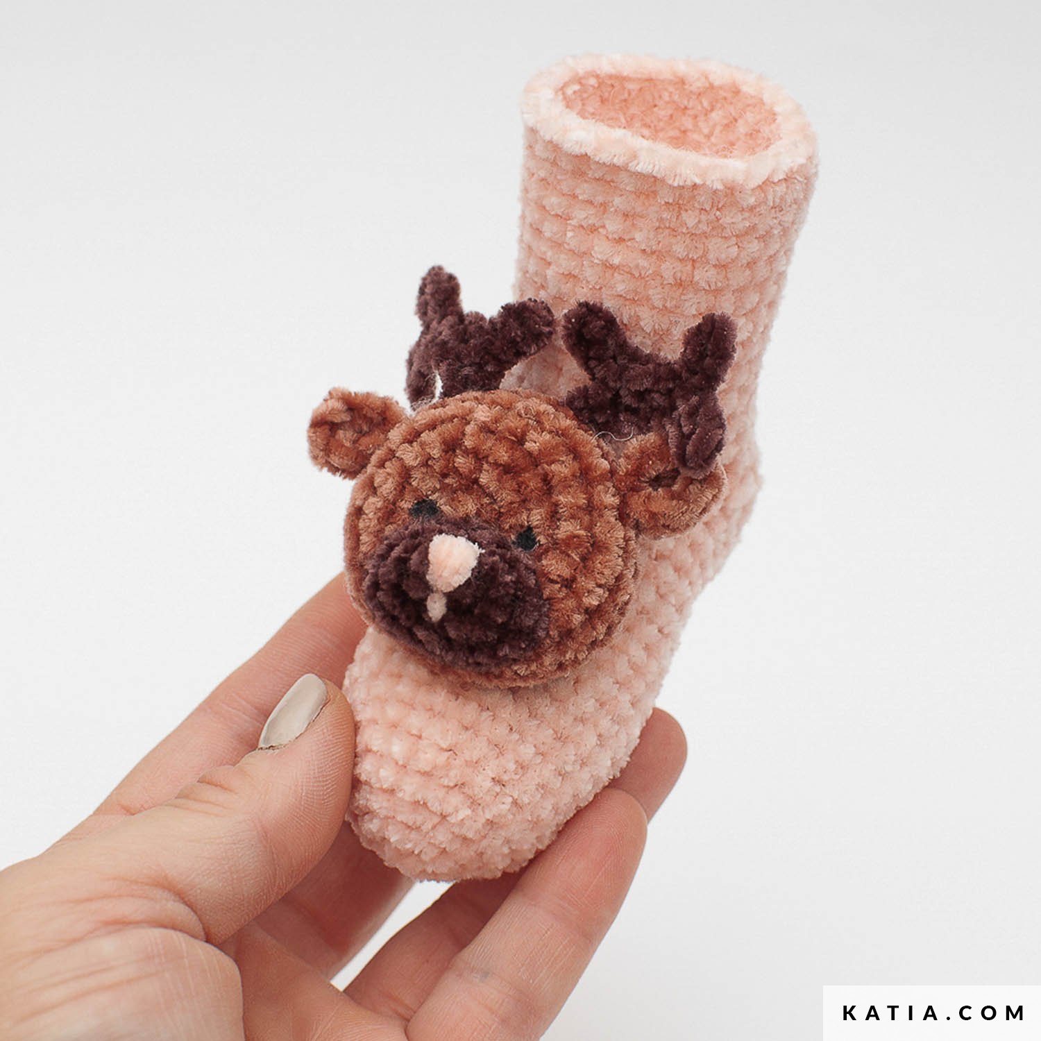Vier Kerstmis extra lief met dit schattige ontwerp van Gallimelmas: gehaakte babysokken met een rendier amigurumi en een superzachte textuur. Haak deze feestelijke slofjes met Katia Sockirumi, een chenillegaren met pluche-effect, perfect om kleine voetjes warm te houden.