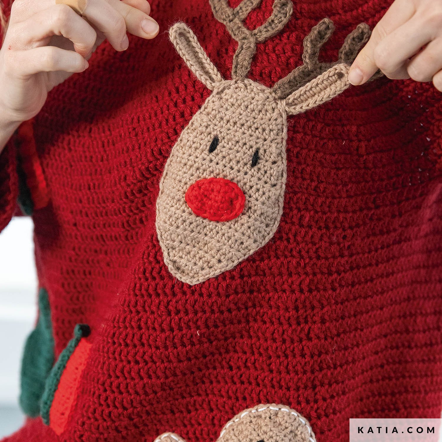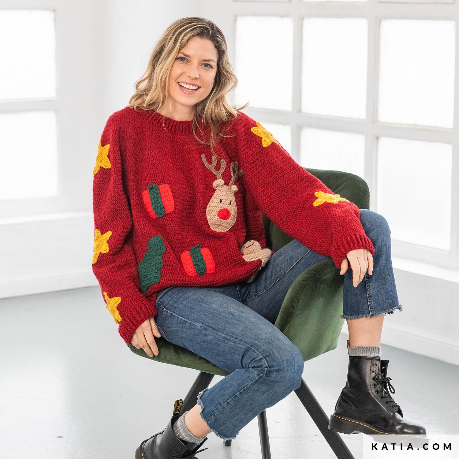 Volg het patroon van Mr. Cey en haak stap voor stap een top-down trui met leuke kerstapplicaties: peperkoekmannetje, rendier, boom, ster, kerstbal, cadeau en sneeuwvlok.