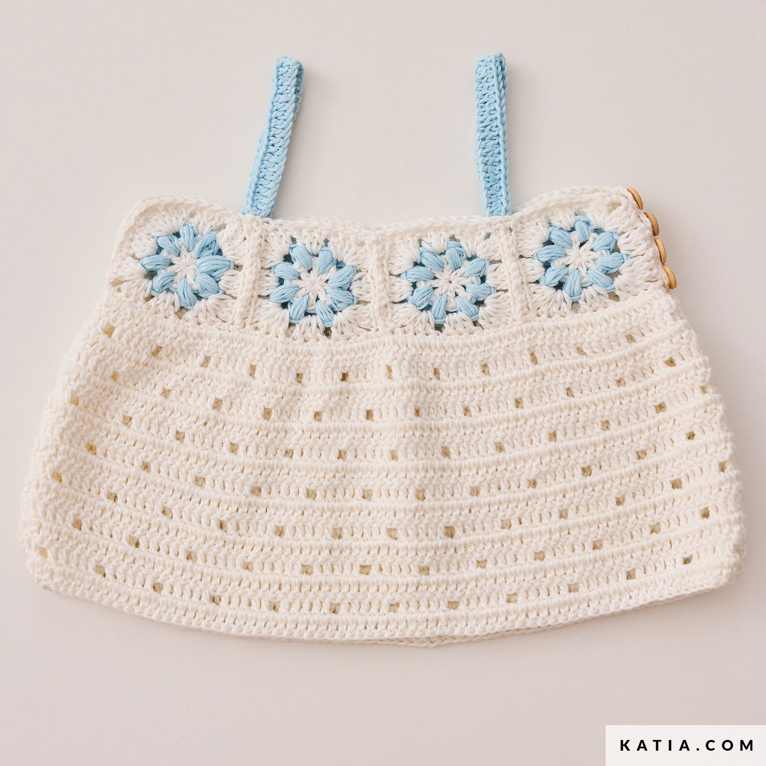 Deze instructies voor een zomerse gehaakte top met Katia Fair Cotton combineren biologische zachtheid met een charmant ontwerp: fantasiepatroon, tweekleurige granny-rij aan de pas, fijne contrasterende bandjes en knopen aan de zijkant. Verkrijgbaar in het tijdschrift Katia Baby 116 en als pdf op katia.com. Haak een fris, licht en perfect zomers kledingstuk voor je baby.