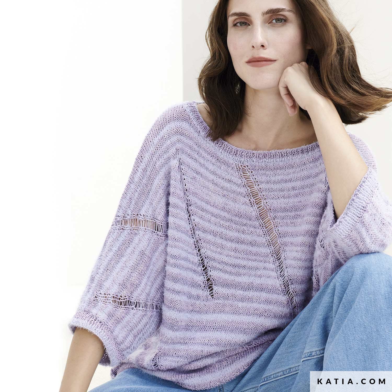 Vind het patroon voor een gebreide trui met vleermuismouwen in het tijdschrift All Seasons 5. Gebruik Lua garen van Concept by Katia, een fantasiegaren dat horizontale strepen creëert met verschillende texturen en tinten van dezelfde kleur. Deze trui met een boothals en 3/4 mouwen heeft een origineel diagonaal kantpatroon. Begin vandaag nog met het breien van dit kledingstuk en combineer het met je favoriete jeans!