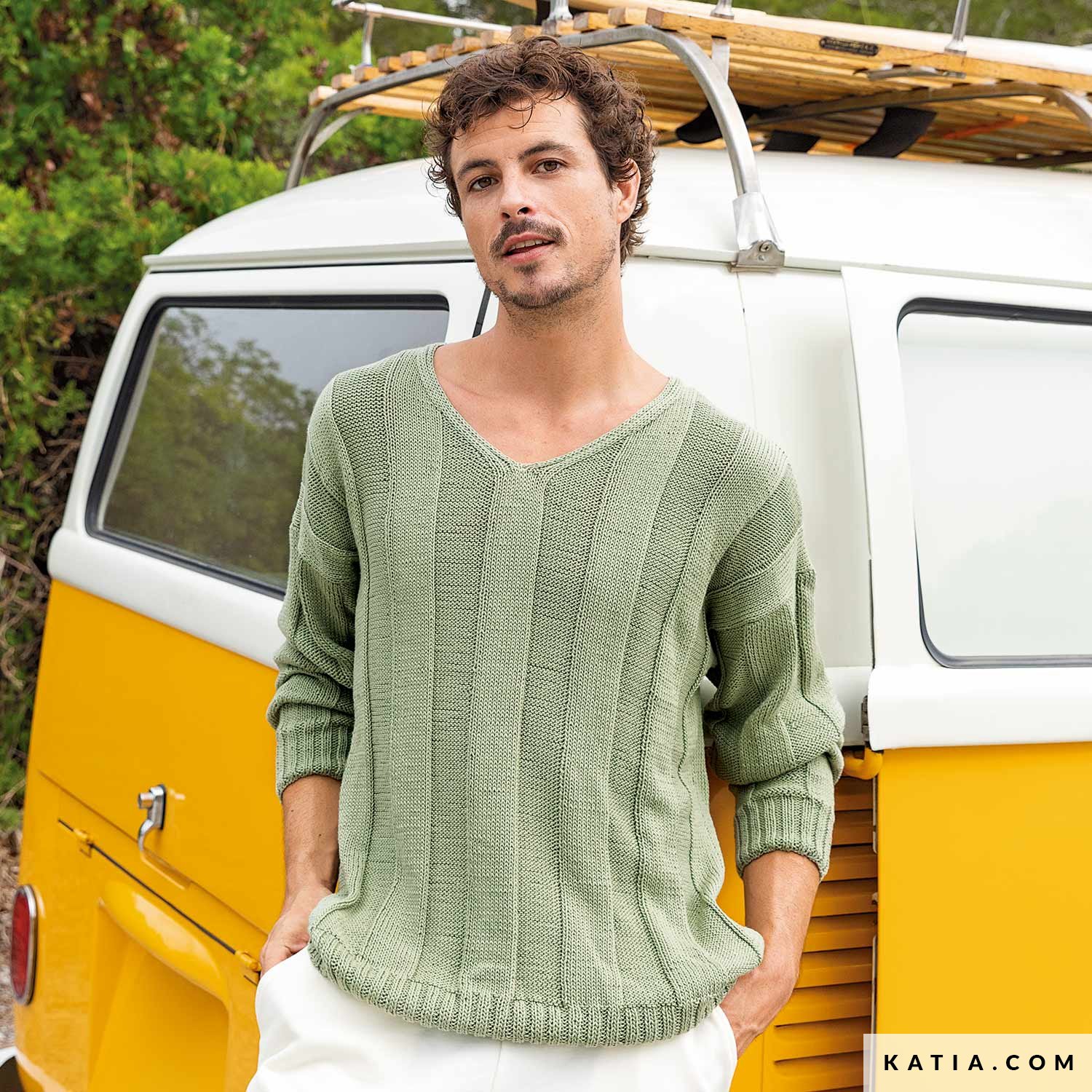 Geef je garderobe een handgemaakt tintje met deze stijlvolle herentrui met V-hals. De grote boorden in de trui worden gemaakt in een 12x12 boordsteek met Tencel-Cotton. Dit garen geeft de trui een uniek zacht en comfortabel gevoel. Het eenvoudige, rechte model maakt je outfit casual en stoer. Combineer het met jeans of een korte broek voor een hippe look!