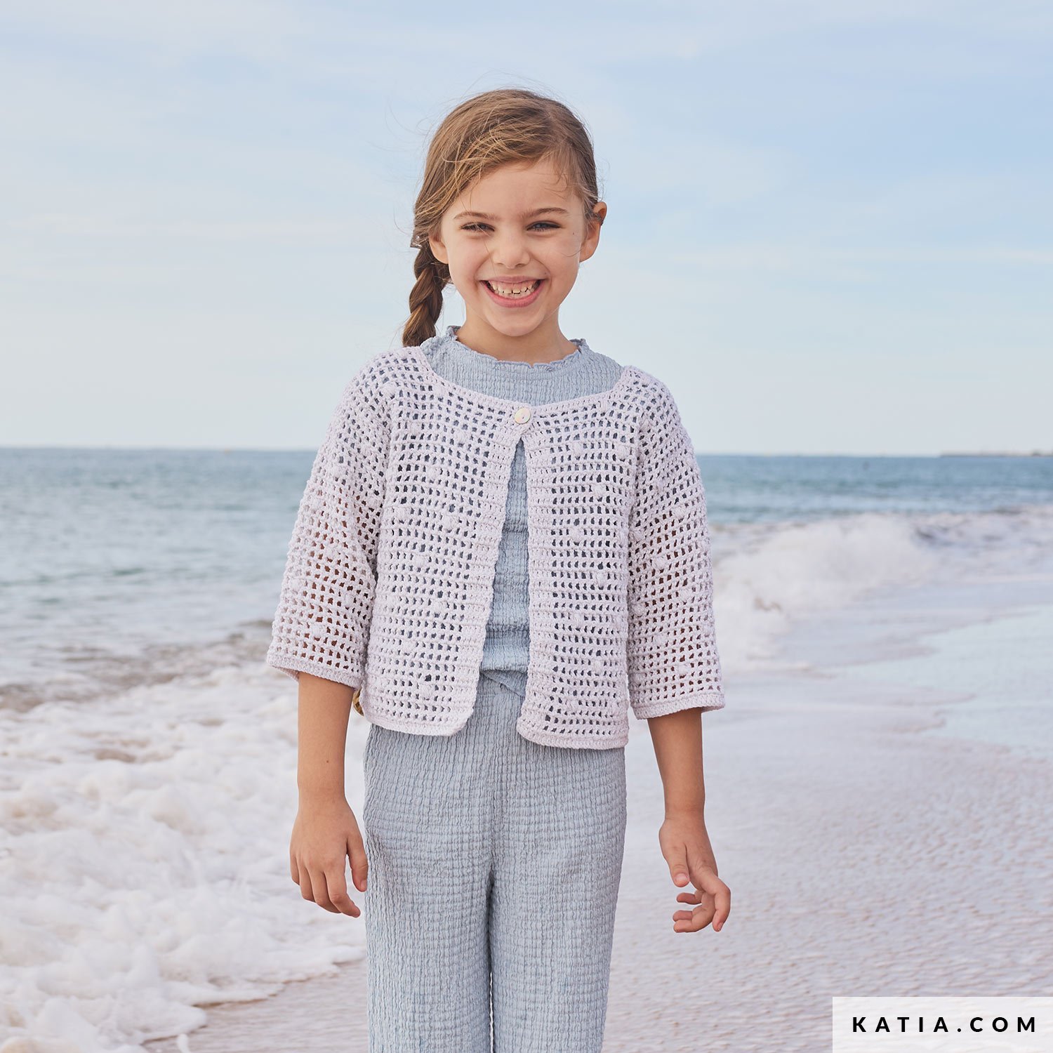 Haak dit jasje met 3/4 mouwen voor meisjes met Katia Estrella, een garen met een subtiele glans. Het korte ontwerp heeft een ajourpatroon en kleine nopjes; sluit met een knoopje aan de hals. Verkrijgbaar in het tijdschrift Katia Kinderen 117 en als pdf op katia.com. Haak een zomers jasje voor je dochter of kleindochter.