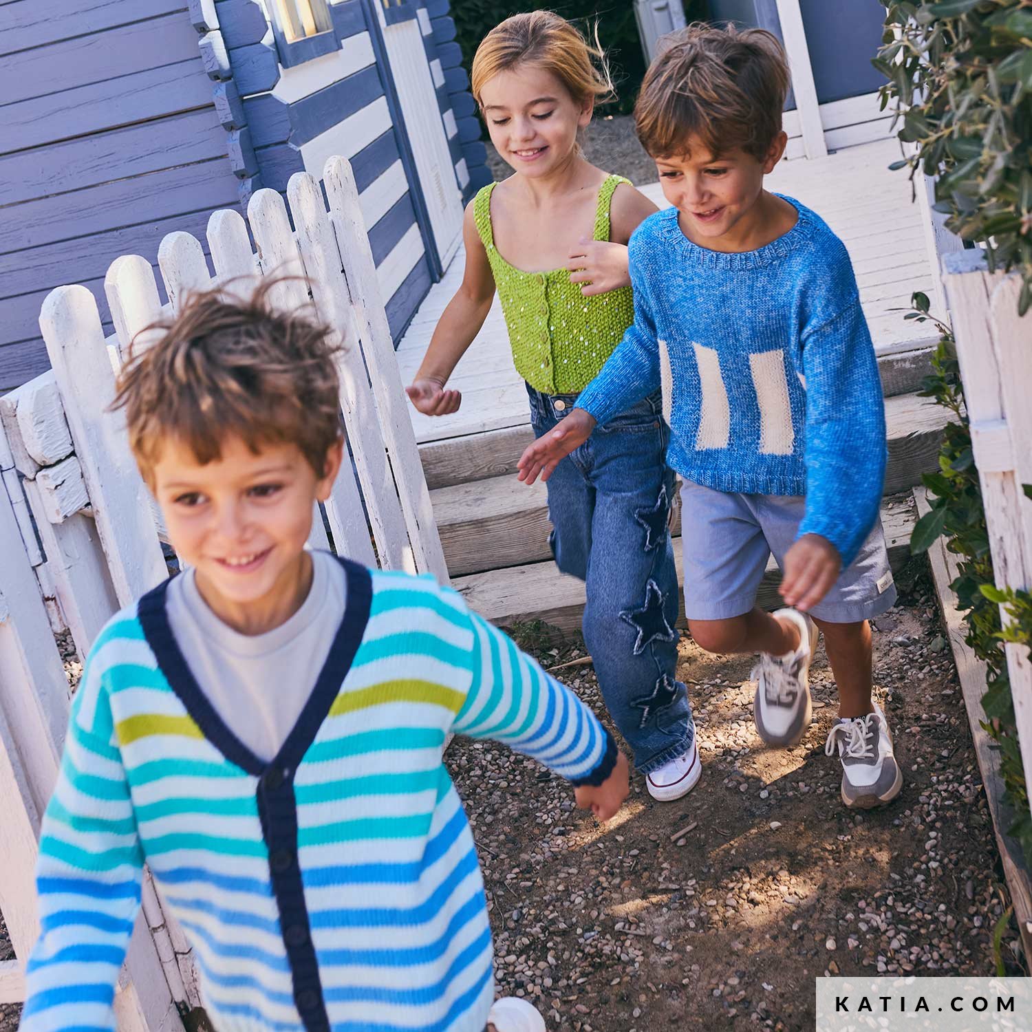 Dit vest combineert biologische Katia Fair Cotton met een vrolijk streepspel in frisse tinten. V-hals, lange mouwen en contrasterende afwerkingen zorgen voor een nette, moderne look. Licht, comfortabel en perfect voor elke dag. Verkrijgbaar in Katia Kinderen 117 en als PDF op katia.com. Brei kleur en plezier in hun garderobe.