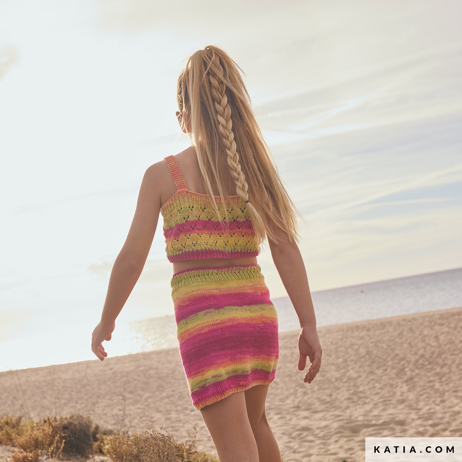 Geef een zomerse uitstraling aan de garderobe van je dochter met deze korte ajourtop en Katia Menfis Color, een zachte katoen in levendige kleuren. Met bandjes en knopen voor; onderdeel van een set met een eenvoudige, bijpassende rok voor de warmste dagen. Vind het patroon in Katia Kinderen 117 en als PDF op katia.com. Maak een handgemaakte top voor jouw dochter.