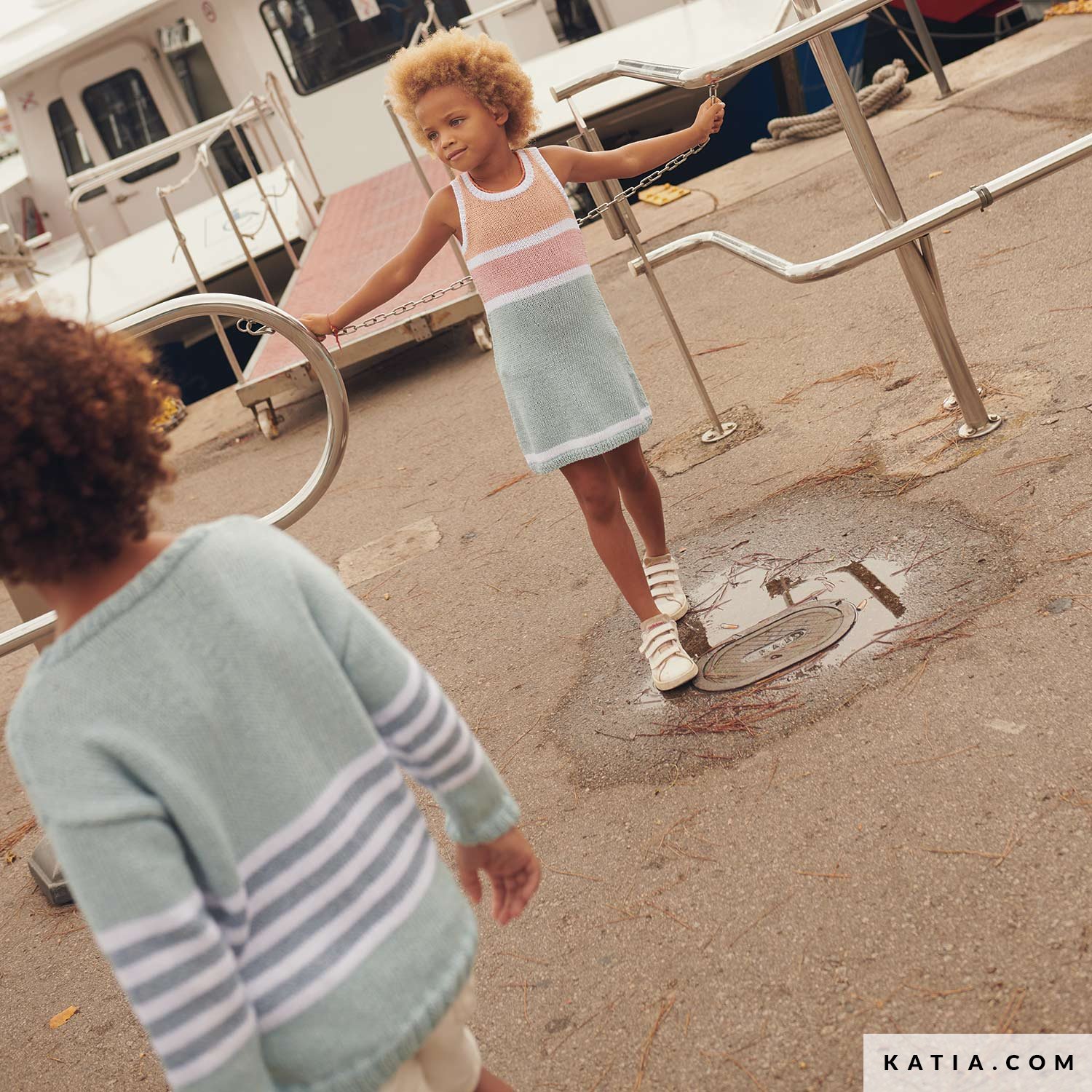 Met deze eenvoudige en moderne gebreide trui zijn de kleintjes klaar voor elk avontuur! Deze klassieke, sportieve trui krijgt een vrolijke marine-look door de strepen op het lijfje en de mouwen. Een comfortabel en veelzijdig stuk voor elke dag. Brei deze instructies voor kinderen van 2 tot 10 jaar met onze Aqua en Summer Comfort garens.