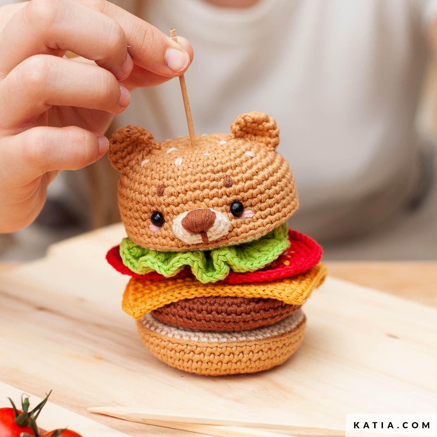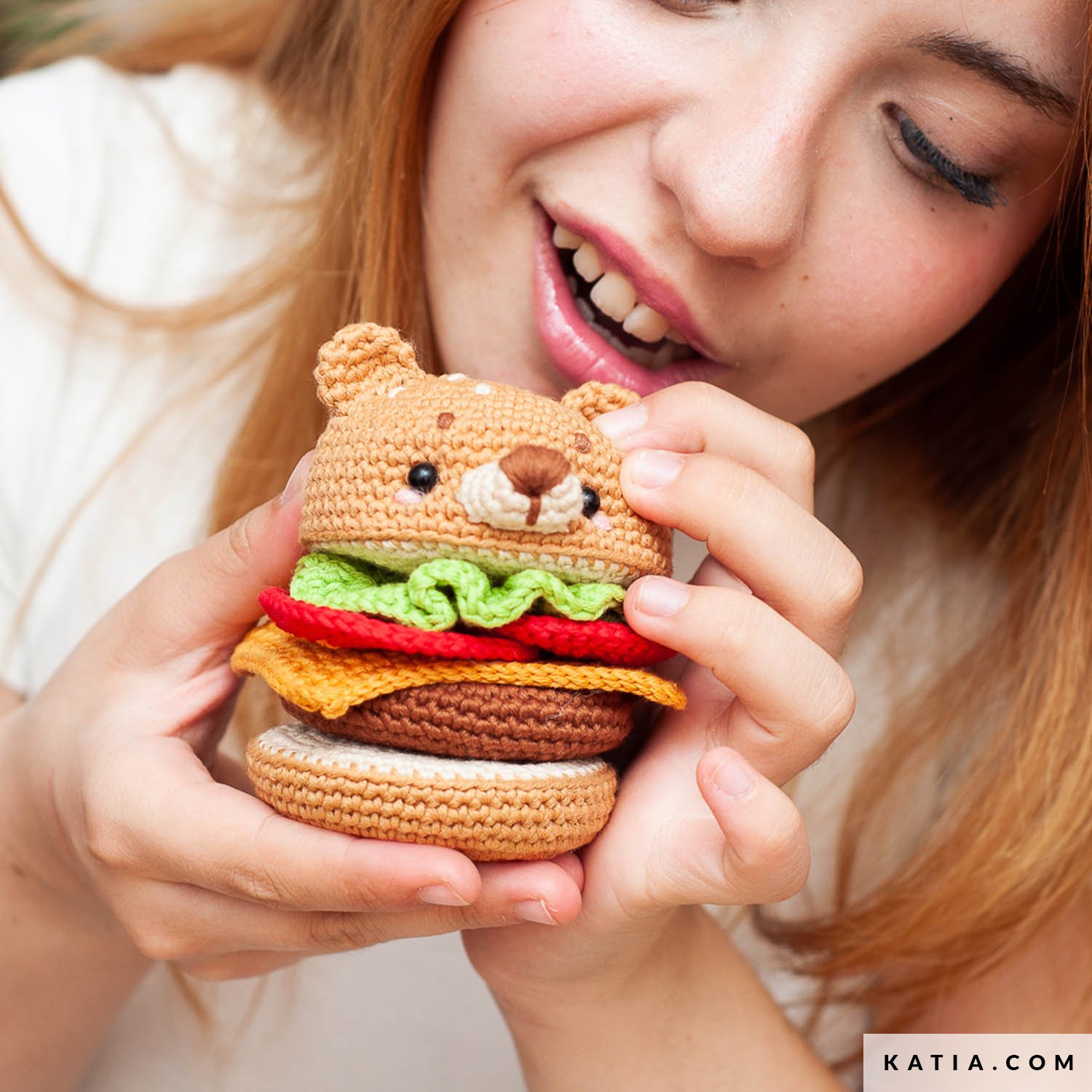 Bear Burger is een schattig beertje dat is veranderd in de leukste en liefste hamburger uit de Snack Time-amigurumiserie, ontworpen door Gallimelmas voor Katia. Deze vrolijke amigurumi combineert een broodje met sesamzaadjes, plakjes kaas, tomaat en sla, allemaal gehaakt met Katia Amigurumi – een 100% katoenen garen met dubbele twist dat prettig haakt. Zijn lieve snoetje en zachte uitstraling maken van deze amigurumi een visueel feest vol humor en tederheid. Perfect voor iedereen die graag figuurtjes haakt met veel smaak en persoonlijkheid.