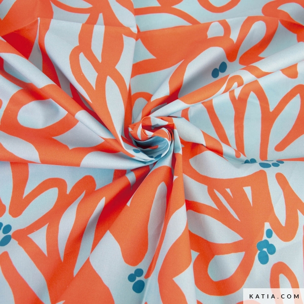 Ontdek de frisheid van tropisch design met onze 100% katoenen popeline stof, bedrukt met een elegant motief. Dit ontwerp toont delicate Tiaré bloemen in oranje tinten op een licht turquoise achtergrond, die de schoonheid van exotische landschappen oproept. Gecertificeerd volgens Standard 100 by Oeko-Tex®, biedt deze stof niet alleen uitzonderlijke kwaliteit, maar ook veiligheid en zachtheid voor de huid. Perfect voor het maken van zomerkleding zoals jurken, blouses, rokken en woonaccessoires. Deze popeline stof voegt een vleugje frisheid en verfijning toe aan je projecten. In de tijdschriften en online patronen van Katia Fabrics vind je veel perfecte patronen voor deze elegante popeline.