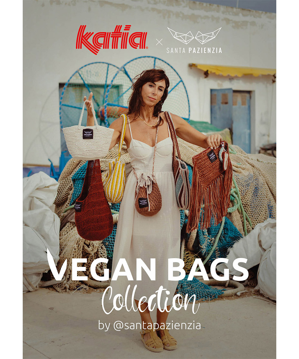 Haak rustig met de hand, laat elke steek met je adem meegaan en geniet van het proces met de Vegan Bags Collection by Santa Pazienzia. Een ebook met 6 gehaakte tassen, ontworpen met Katia The Vegan Bag, een duurzaam garen van lyocell en ananasbladvezel.