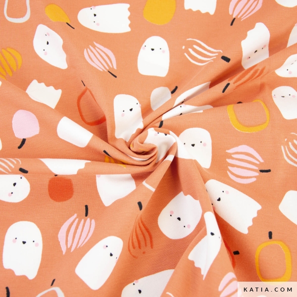 Materiał na metr, dzianinowy materiał na koszulkę Halloween Ghosts z nadrukiem duchów i dyni na pomarańczowym tle. Ta bawełniana tkanina zawiera 5% elastanu, co zapewnia większy komfort i elastyczność. Ten miękki i wygodny materiał dzianinowy od Katia Fabrics doskonale nadaje się do szycia koszulek lub spodni dla najmłodszych. Połącz ten materiał dzianinowy z jednokolorowymi materiałami dzianinowymi od Katia Fabrics, aby uzyskać wyjątkowo wygodny wygląd.
