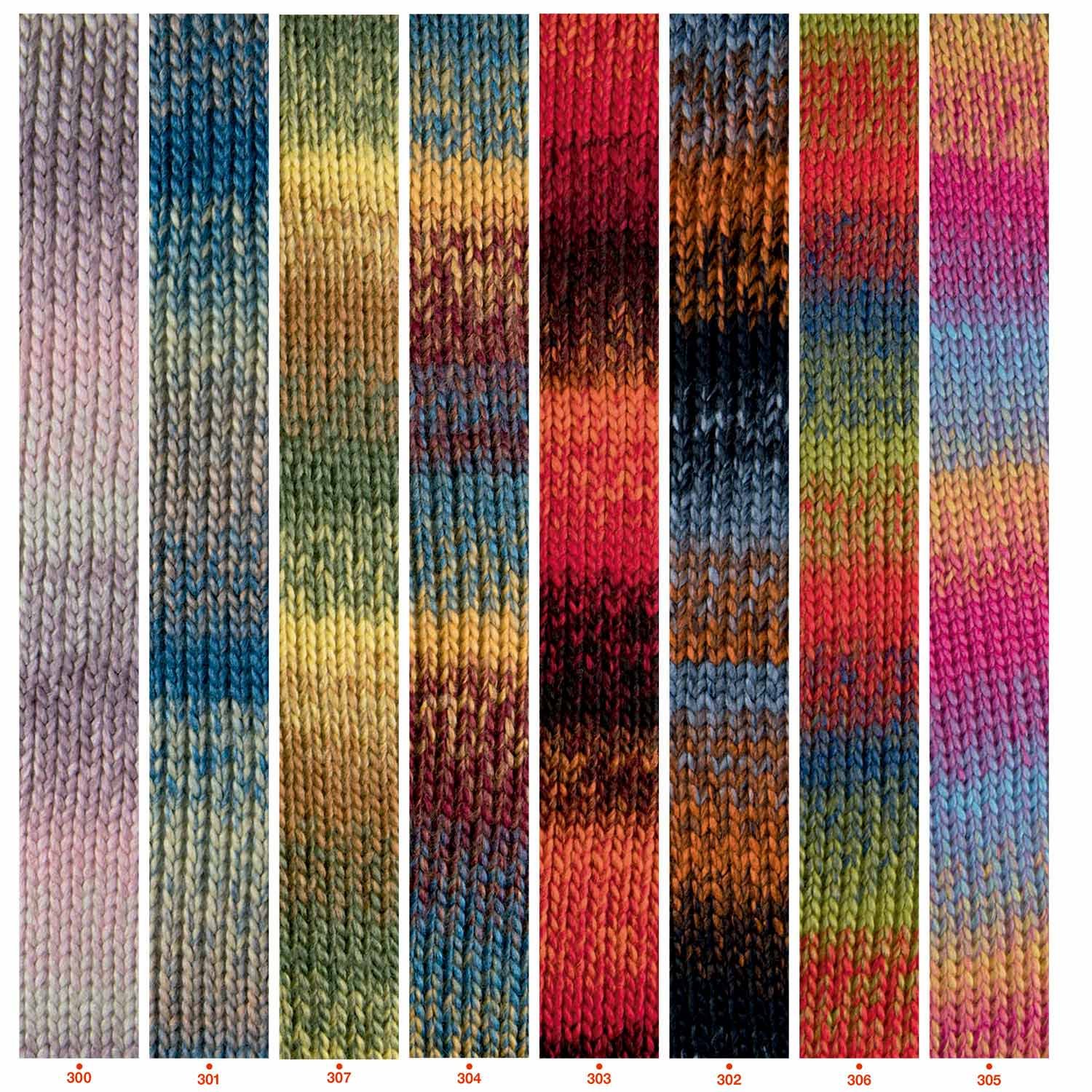 Puszysta i mięsista włóczka w 100% akrylowa w jasnych, melanżowych kolorach.