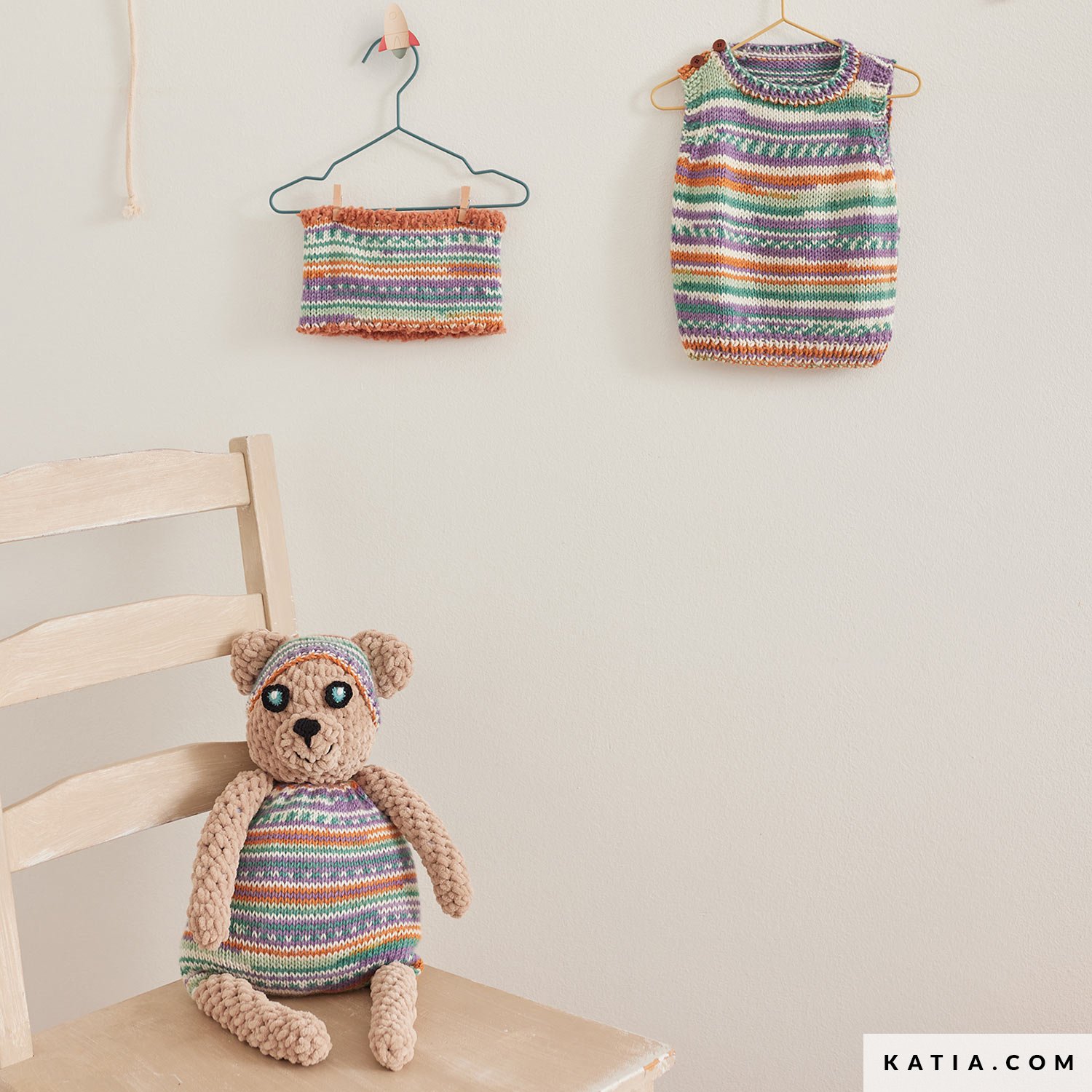 Wykonaj uroczą pluszową zabawkę z włóczki Katia Bambi, bardzo miękkiej włóczki szenilowej, według wzoru dostępnego w Katia Baby Magazine 110. Korpus tego wesołego amigurumi jest wykonany na drutach z włóczki Katia Baby Jacquard, dodając odrobinę koloru. Ta pluszowa zabawka szybko stanie się nieodłącznym przyjacielem Twojego malucha. Dziergaj wyjątkowego towarzysza dla swojego dziecka!