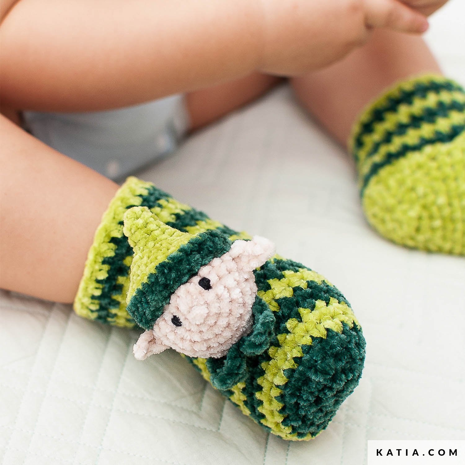 Wykonane z włóczki Katia Sockirumi, miękkiej pluszowej chenilli idealnej dla delikatnych stópek.