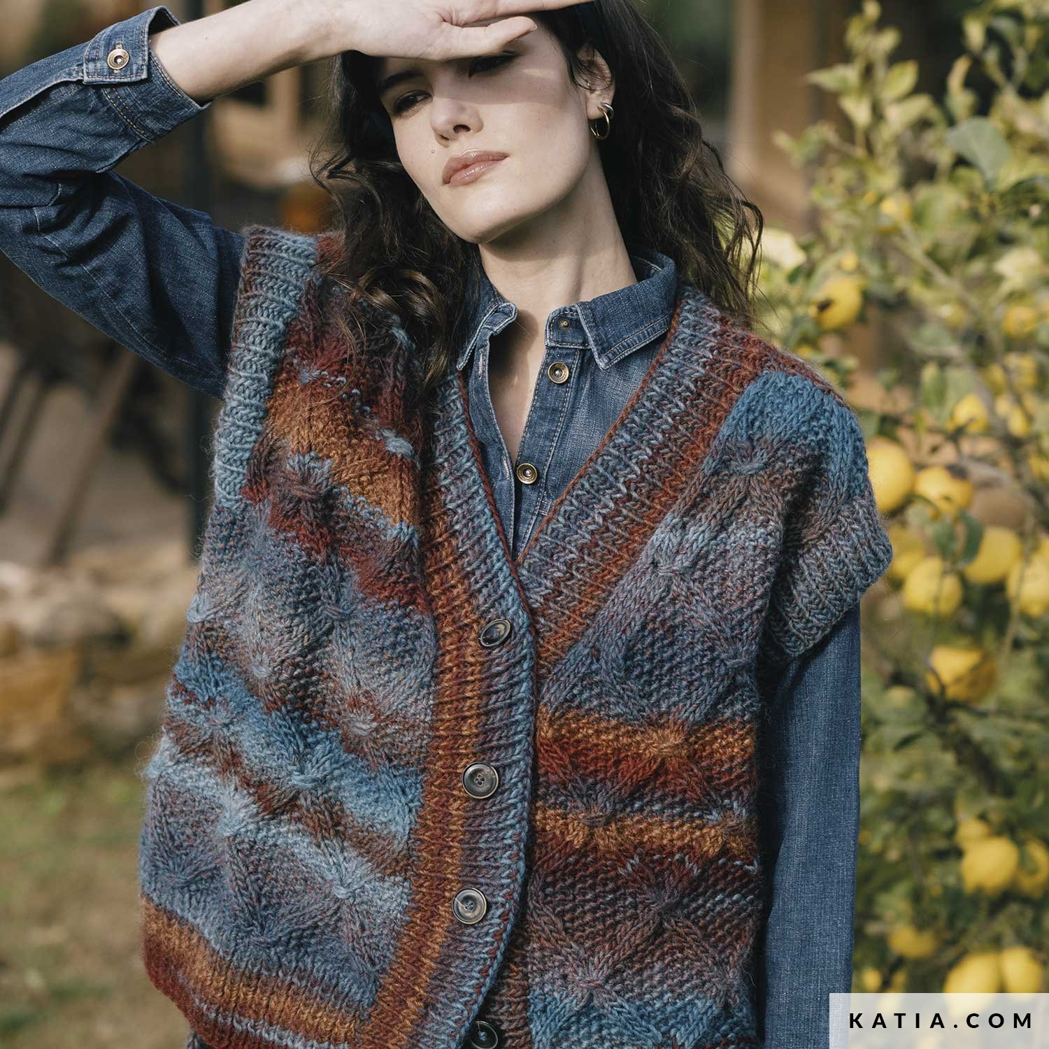 Jeśli również uwielbiasz dzianinowe kamizelki, dodaj ten wzór do swojej kolejki dzianin obowiązkowych. Stwórz oversizową kamizelkę damską z pochlebną kombinacją zimowych, wielokolorowych odcieni Azteca. Wzór z obniżonym dołem i diamentowym ściegiem z przodu. Idealna kamizelka do noszenia z dżinsami!