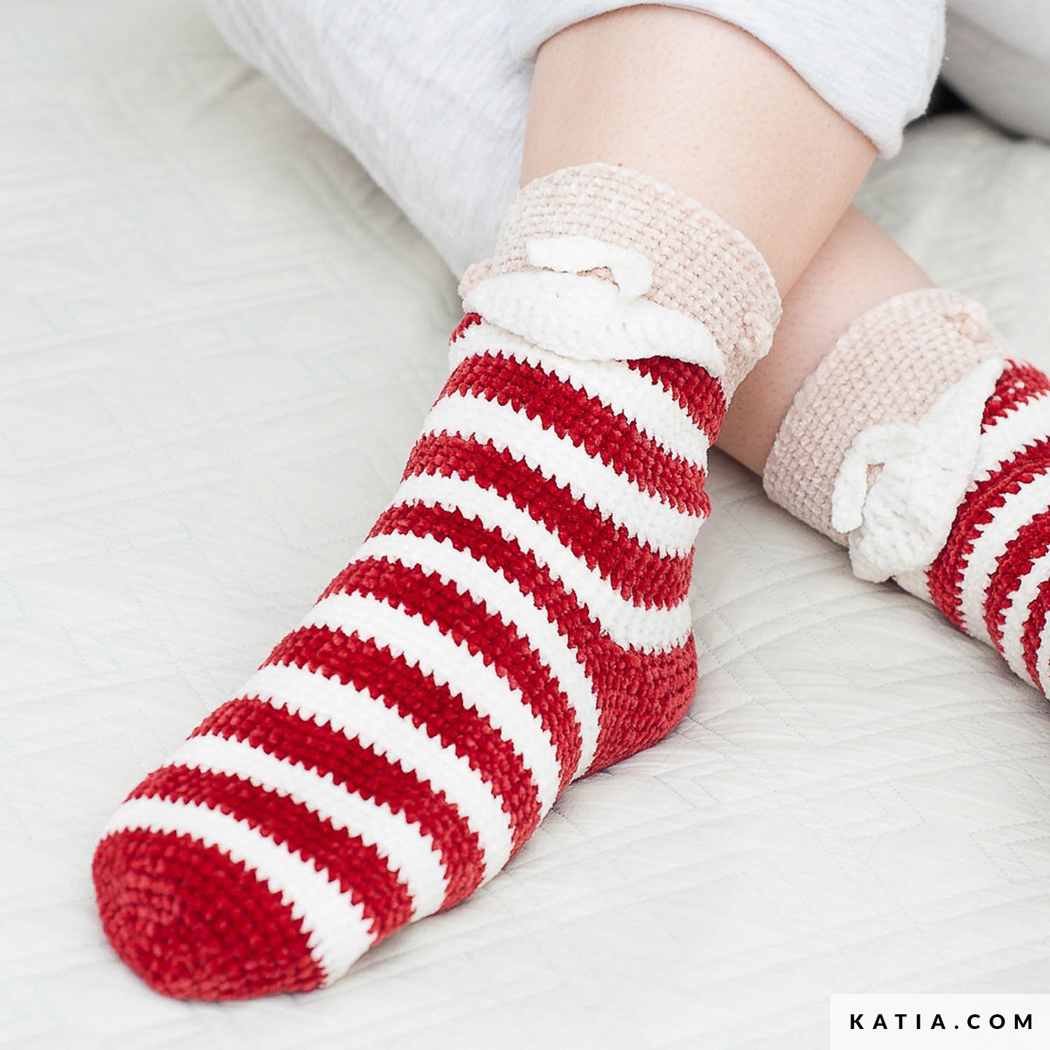 Wykonane z włóczki Katia Sockirumi – miękkiej chenilli o efekcie pluszu – idealnie nadają się na prezent lub do noszenia w domu w świątecznym okresie.