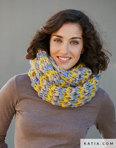 Wydziergaj ciepły podwójny komin z 3 kolorów Katia Love Wool. Projekt w ściegu francuskim z prostym wzorem pasków. Połącz końce, aby zamknąć tubę. Szybki, kolorowy dodatek na zimę.