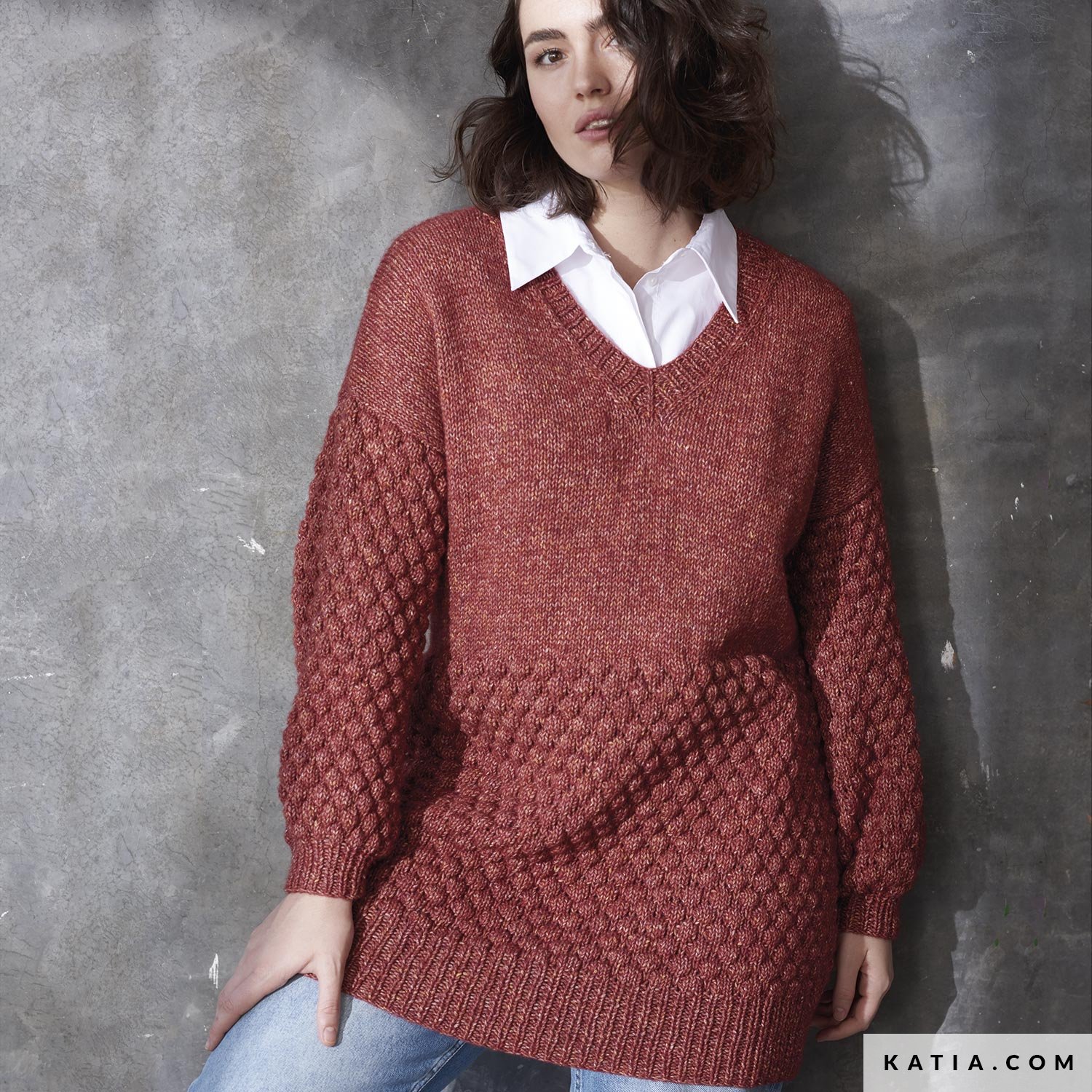 Sweter z dekoltem w kształcie litery V, wykonany z dzianiny Cotton-Merino Tweed i kilkoma różnymi ściegami. Z jednej strony ściągacz przy dekolcie, obszyciach i mankietach, z drugiej strony ścieg stebnowy na wierzchu swetra i wreszcie ciekawy ścieg bąbelkowy, który tworzy efekt wyściełania na rękawach i na dole ubrania.